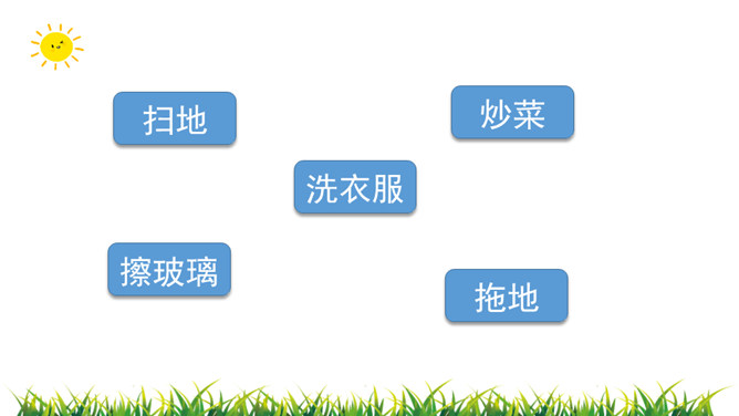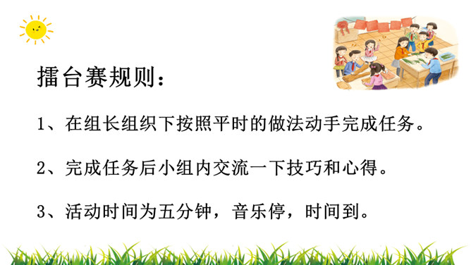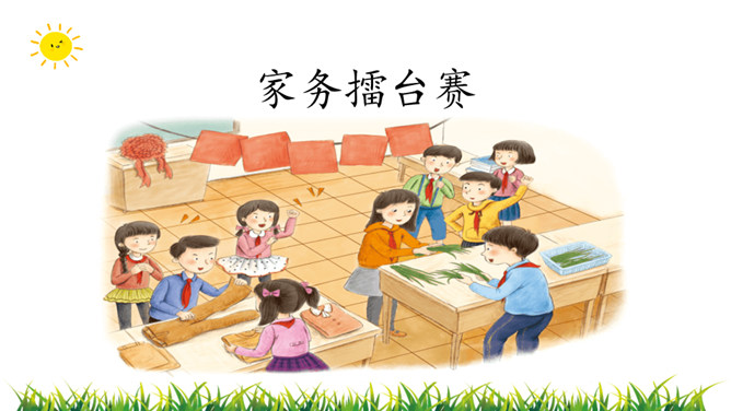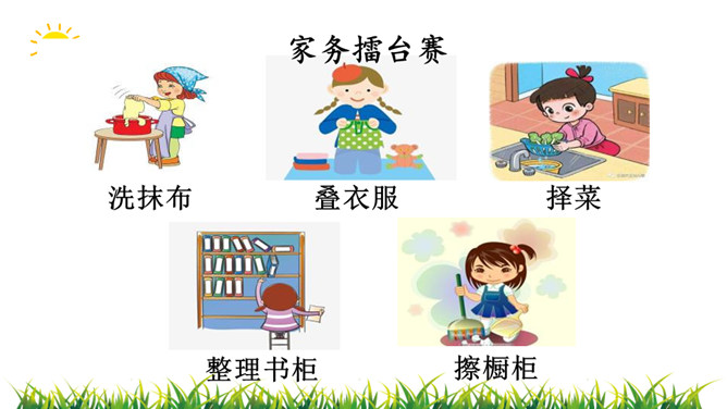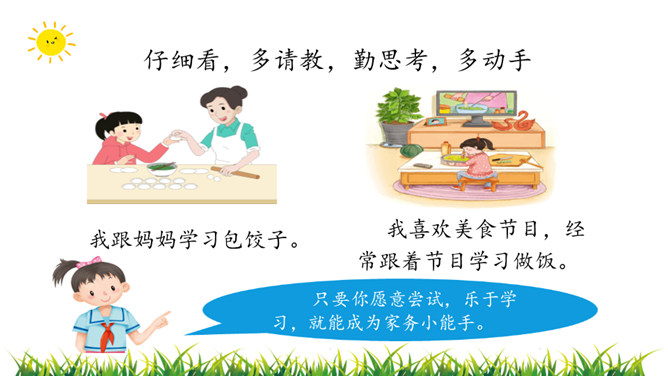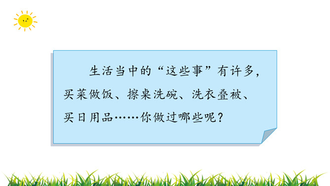 生活当中的“这些事”有许多,买菜做饭、擦桌洗碗、洗衣叠被、买日用品……你做过哪些呢?擂台赛规则:1、在组长组织下按照平时的做法动手完成任务。2、完成任务后小组内交流一下技巧和心得。3、活动时间为五分钟,音乐停,时间到。仔细看,多请教,勤思考,多动手。我跟妈妈学习包饺子。我喜欢美食节目,经常跟着节目学习做饭。只要你愿意尝试,乐于学习,就能成为家务小能手。我是家务小能手。所属专题:这些事我来做ppt。