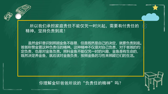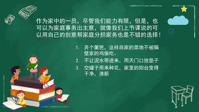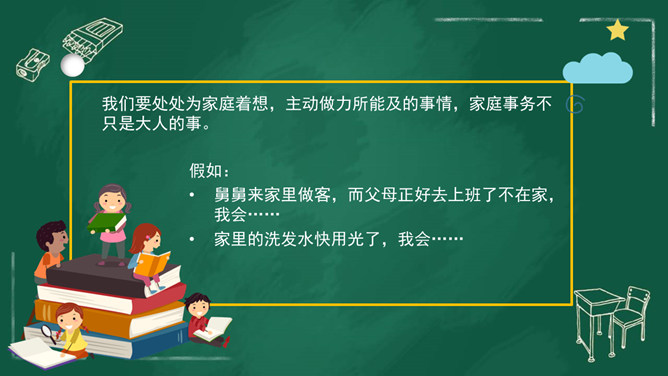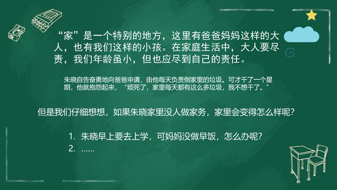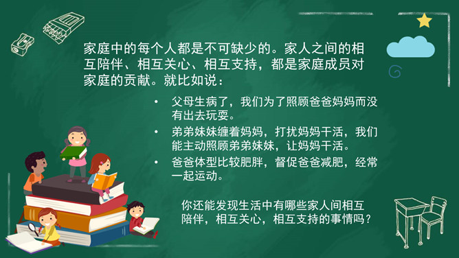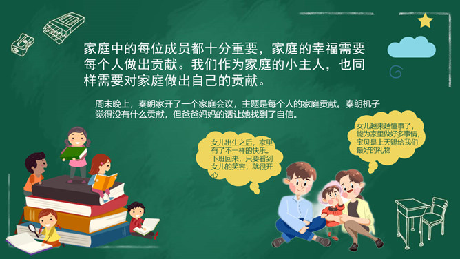 家庭中的每位成员都十分重要,家庭的幸福需要每个人做出贡献。我们作为家庭的小主人,也同样需要对家庭做出自己的贡献。周末晚上,秦朗家开了一个家庭会议,主题是每个人的家庭贡献。秦朗机子觉得没有什么贡献,但爸爸妈妈的话让她找到了自信。女儿出生之后,家里有了不一样的快乐。下班回来,只要看到女儿的笑容,就很开心。女儿越来越懂事了,能为家里做好多事情,宝贝是上天赐给我们最好的礼物。家庭中的每个人都是不可缺少的。家人之间的相互陪伴、相互关心、相互支持,都是家庭成员对家庭的贡献。所属专题:我的家庭贡献与责任ppt。