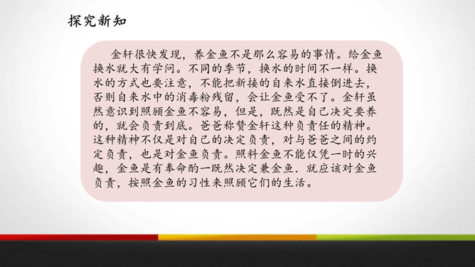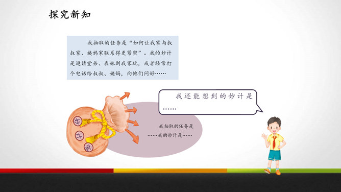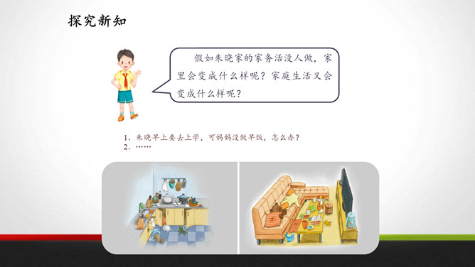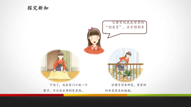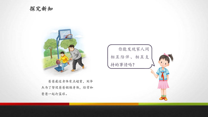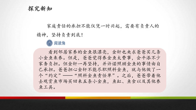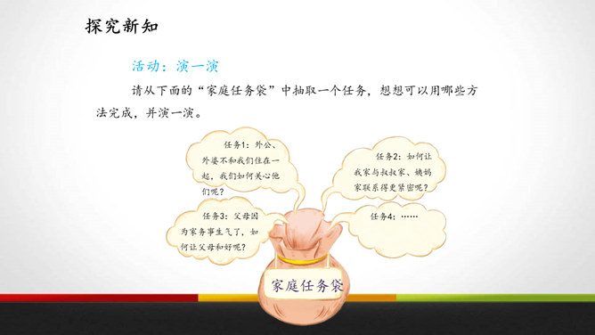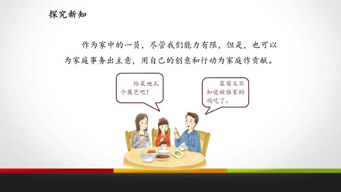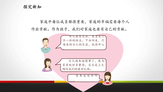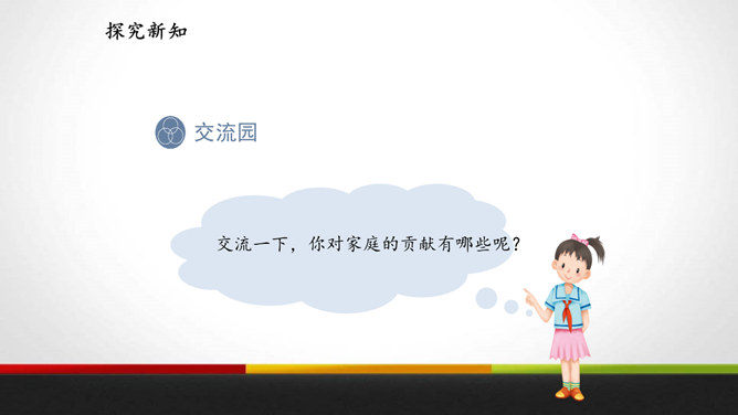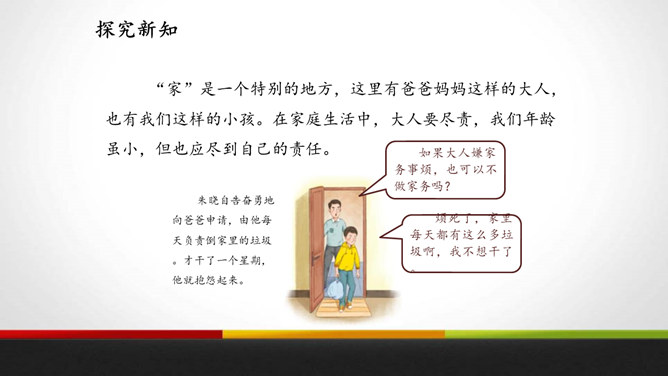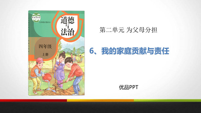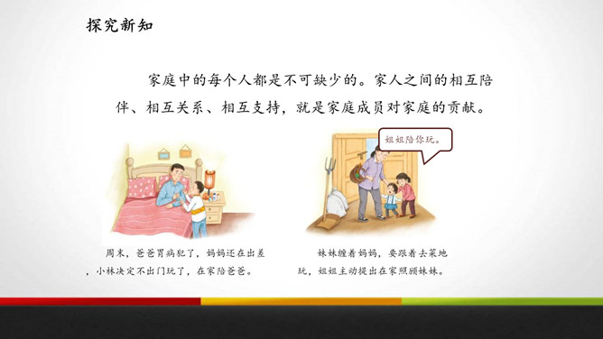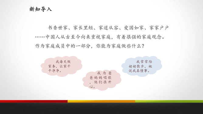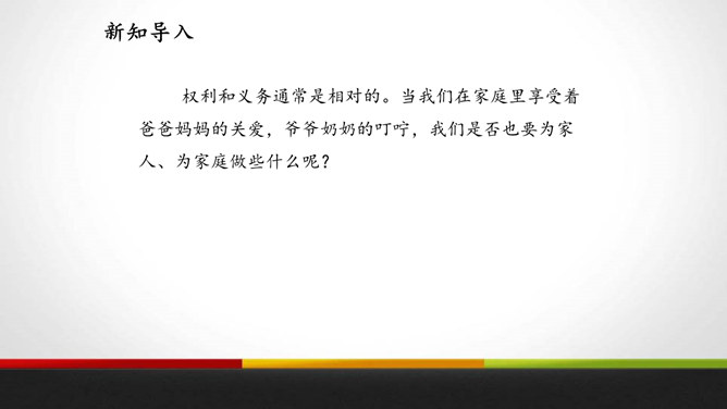 书香世家、家长里短、家道从容、爱国如家、家家户户……中国人从古至今向来重视家庭,有着很强的家庭观念。作为家庭成员中的一部分,你能为家庭做些什么?我每天做家务,让家干干净净。我为爸爸妈妈唱歌,他们很开心。我常常陪姥姥散步,她说我真懂事。作为家中的一员,尽管我们能力有限,但是,也可以为家庭事务出主意,用自己的创意和行动为家庭作贡献。权利和义务通常是相对的。当我们在家庭里享受着爸爸妈妈的关爱,爷爷奶奶的叮咛,我们是否也要为家人、为家庭做些什么呢?所属专题:我的家庭贡献与责任ppt。