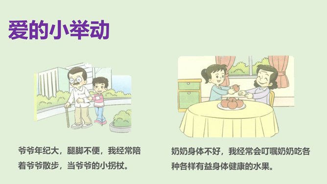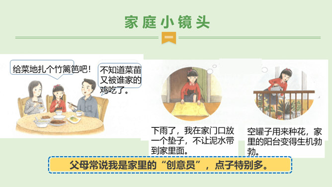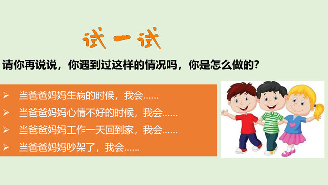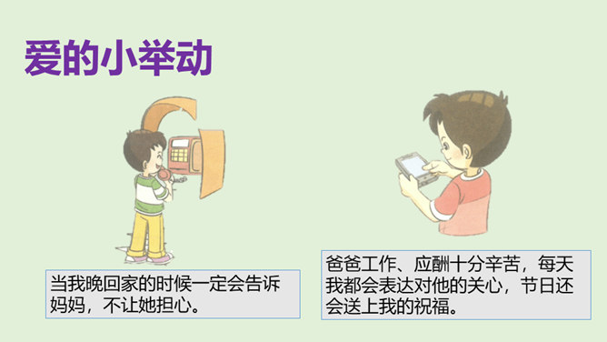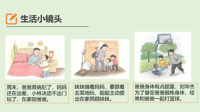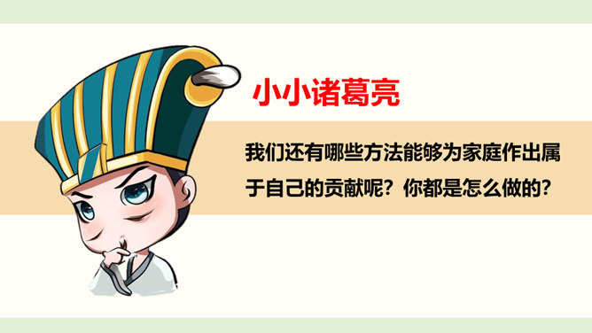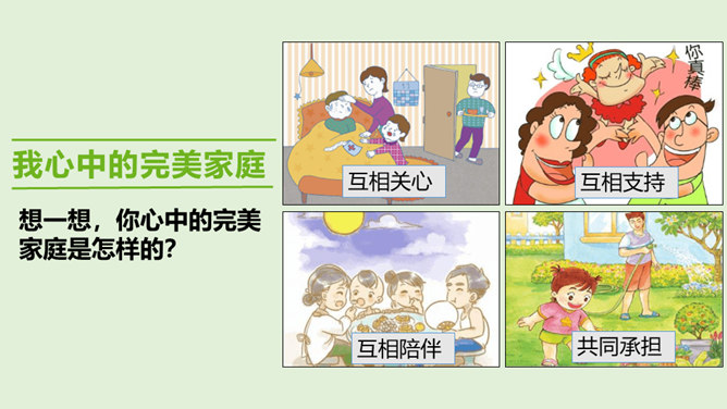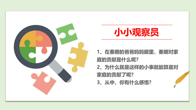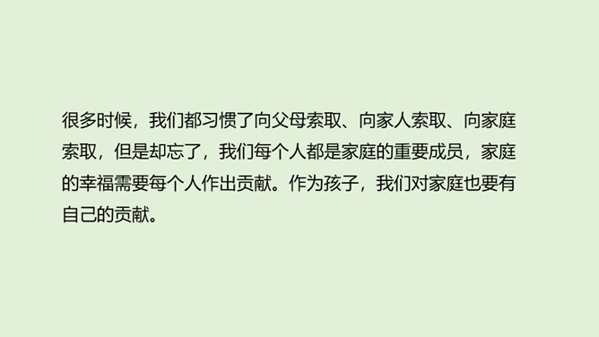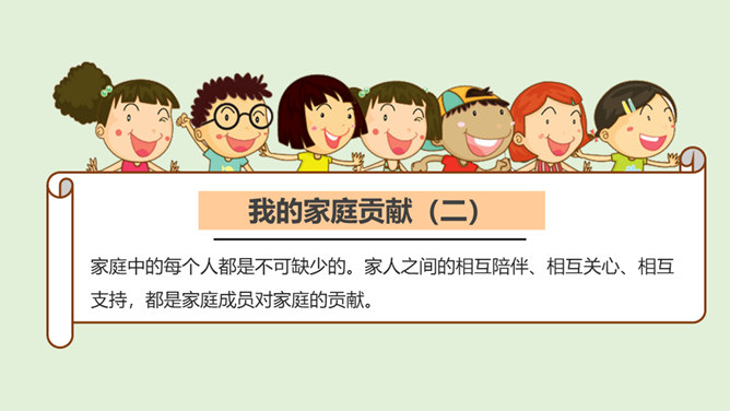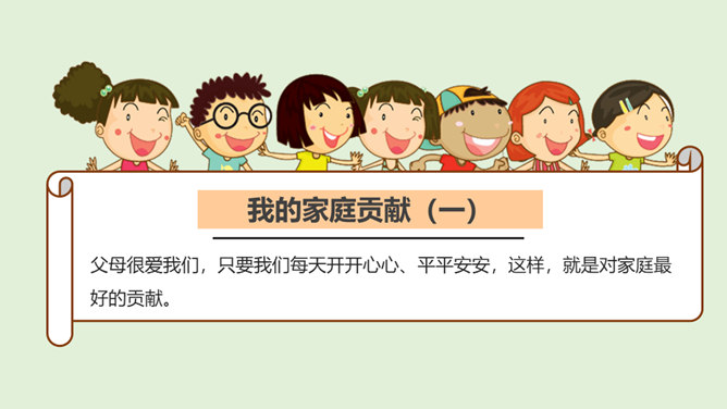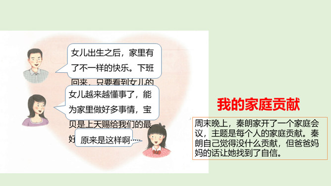 1.你是怎么看待小男孩的做法的?从故事当中,你知道了一个怎样的道理?2.你觉得男孩和树的关系,有点像谁和谁的关系呢?很多时候,我们都习惯了向父母索取、向家人索取、向家庭索取,但是却忘了,我们每个人都是家庭的重要成员,家庭的幸福需要每个人作出贡献。作为孩子,我们对家庭也要有自己的贡献。周末晚上,秦朗家开了一个家庭会议,主题是每个人的家庭贡献。秦朗自己觉得没什么贡献,但爸爸妈妈的话让她找到了自信。在秦朗的爸爸妈妈眼里,秦朗对家庭的贡献是什么呢?所属专题:我的家庭贡献与责任ppt。