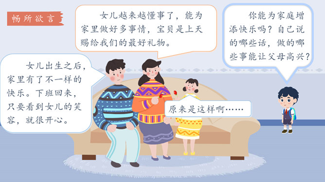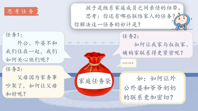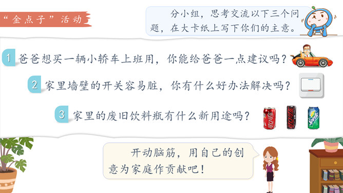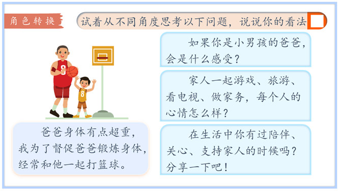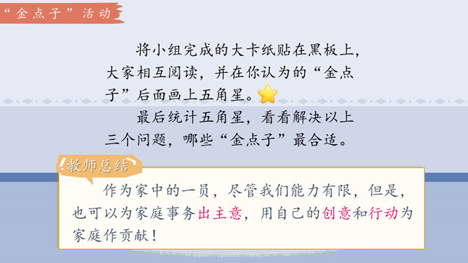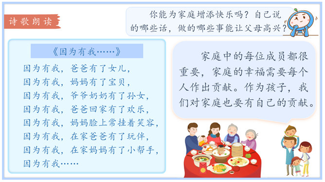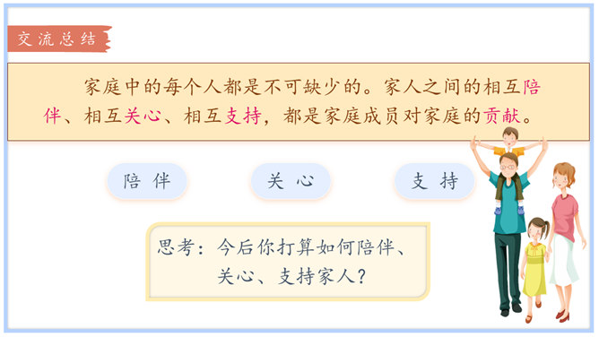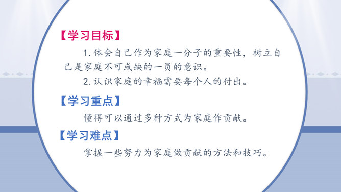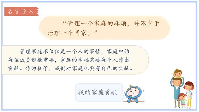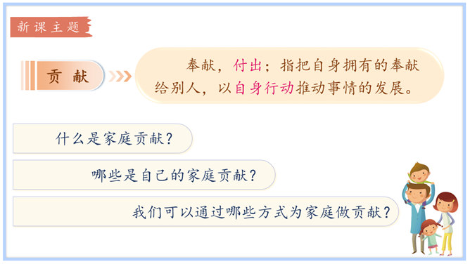 学习目标:1.体会自己作为家庭一分子的重要性,树立自己是家庭不可或缺的一员的意识。2.认识家庭的幸福需要每个人的付出。学习重点:懂得可以通过多种方式为家庭作贡献。学习难点:掌握一些努力为家庭做贡献的方法和技巧。奉献,付出;指把自身拥有的奉献给别人,以自身行动推动事情的发展。什么是家庭贡献?哪些是自己的家庭贡献?我们可以通过哪些方式为家庭做贡献?管理家庭不仅仅是一个人的事情,家庭中的每位成员都很重要,家庭的幸福需要每个人作出贡献。作为孩子,我们对家庭也要有自己的贡献。所属专题:我的家庭贡献与责任ppt。