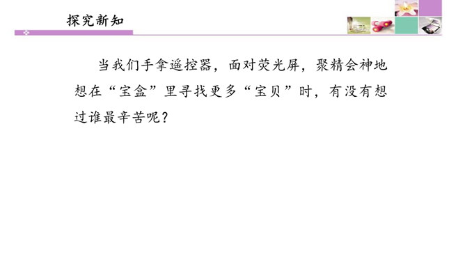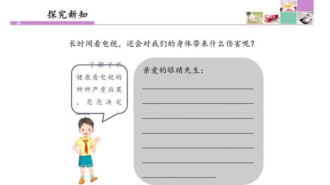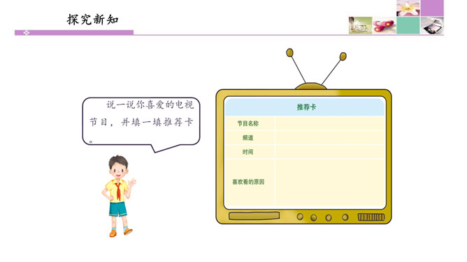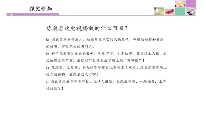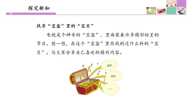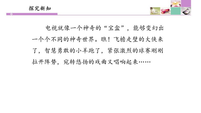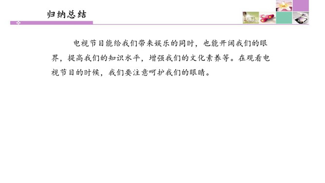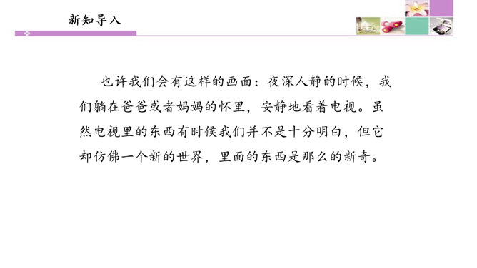 也许我们会有这样的画面:夜深人静的时候,我们躺在爸爸或者妈妈的怀里,安静地看着电视。虽然电视里的东西有时候我们并不是十分明白,但它却仿佛一个新的世界,里面的东西是那么的新奇。电视就像一个神奇的“宝盒”,能够变幻出一个个不同的神奇世界。瞧!飞檐走壁的大侠来了,智慧勇敢的小羊跑了,紧张激烈的球赛刚刚拉开阵势,宛转悠扬的戏曲又唱响起来……你最喜欢电视播放的什么节目?我最喜欢看动画片。动画片里丰富的人物表情、夸张的动作和有趣的情节,有说不出的吸引力。所属专题:健康看电视ppt。