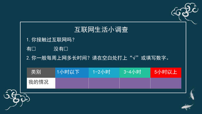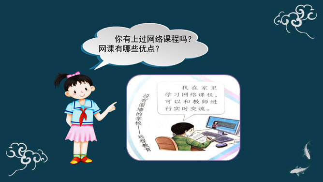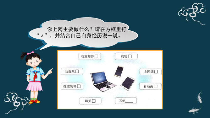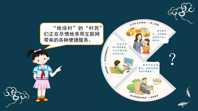 从古至今人们都是怎样传递信息的?互联网让辽阔的地球变成了一个“小村庄”,“地球村”的称呼由此而来。你上网主要做什么?请在方框里打“√”,并结合自己自身经历说一说。“地球村”的“村民”们正在尽情地享用互联网带来的各种便捷服务。你家网购过哪些商品?网购有哪些优点?你有上过网络课程吗?网课有哪些优点?同学们,你还知道哪些网络新事物呢?随着互联网技术的发展,“地球村”的“村民”们生活发生了翻天覆地的变化,新世界,很精彩。互联网虽然是一个虚拟的世界,但是它和现实世界一样有自己的规则。所属专题:网络新世界ppt。