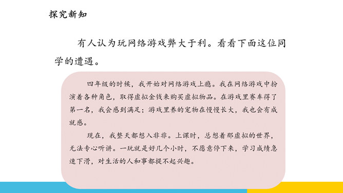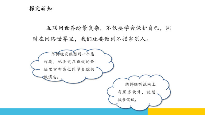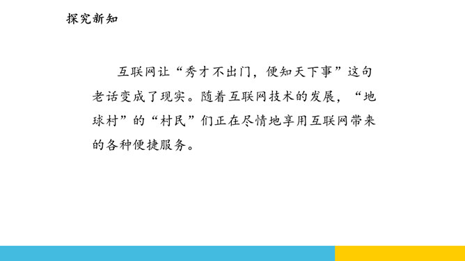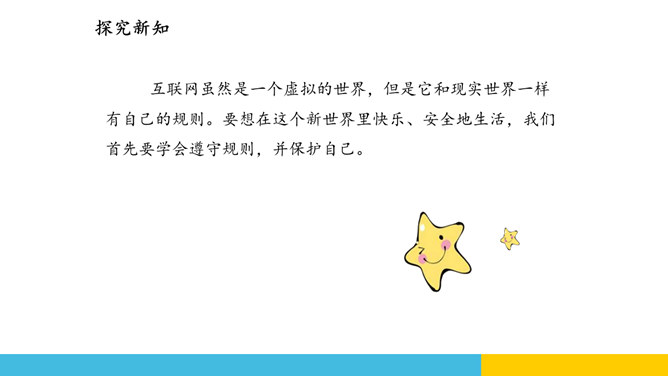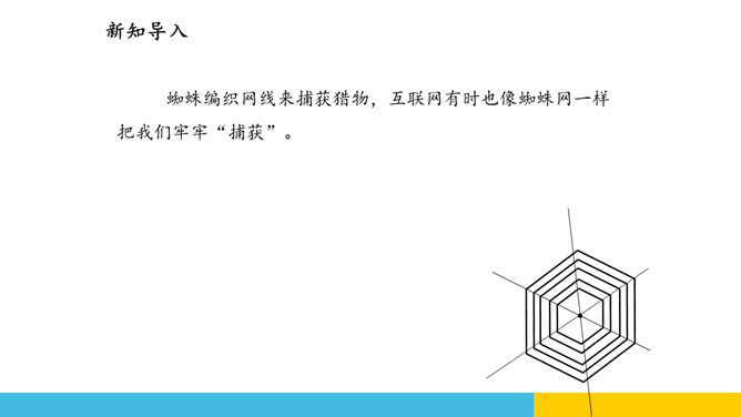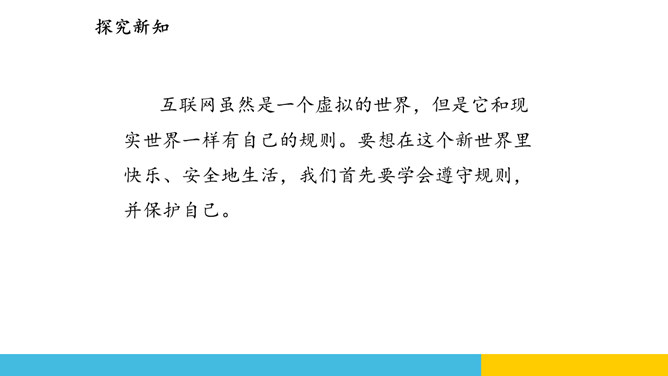 蜘蛛编织网线来捕获猎物,互联网有时也像蜘蛛网一样把我们牢牢“捕获”。互联网虽然是一个虚拟的世界,但是它和现实世界一样有自己的规则。要想在这个新世界里快乐、安全地生活,我们首先要学会遵守规则,并保护自己。互联网让“秀才不出门,便知天下事”这句老话变成了现实。随着互联网技术的发展,“地球村”的“村民”们正在尽情地享用互联网带来的各种便捷服务。互联网虽然是一个虚拟的世界,但是它和现实世界一样有自己的规则。要想在这个新世界里快乐、安全地生活,我们首先要学会遵守规则,并保护自己。所属专题:网络新世界ppt。
