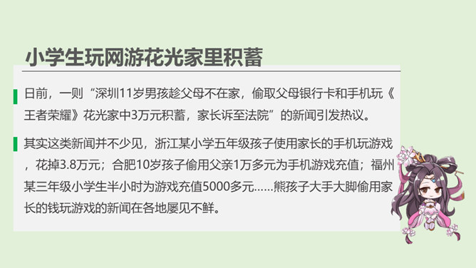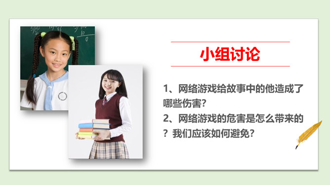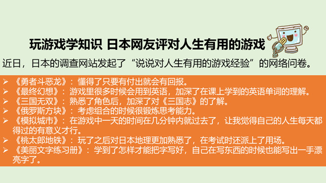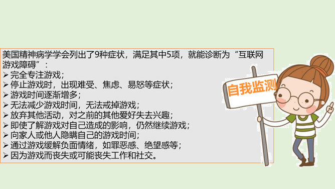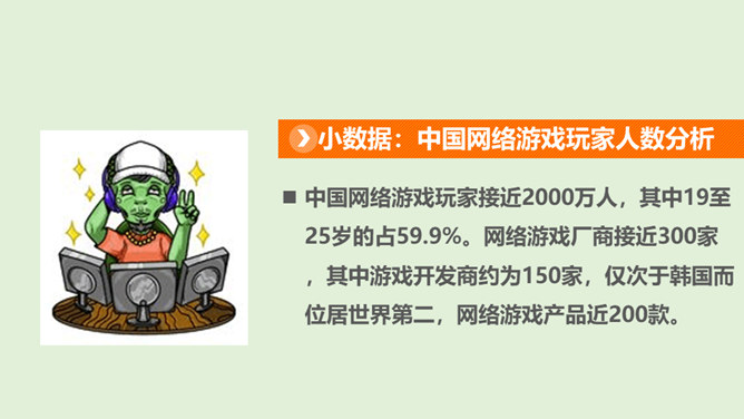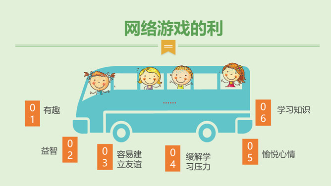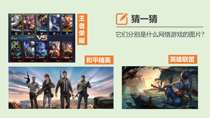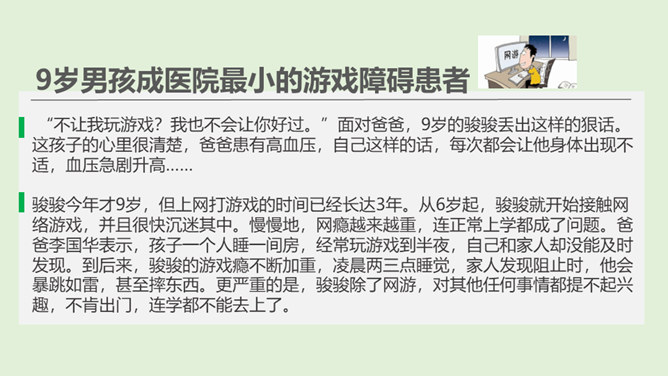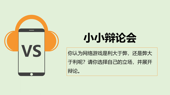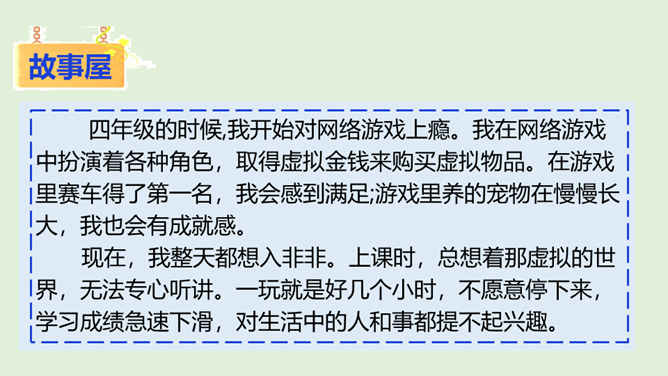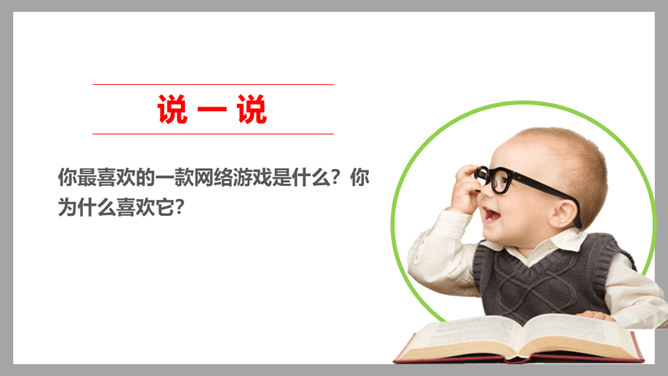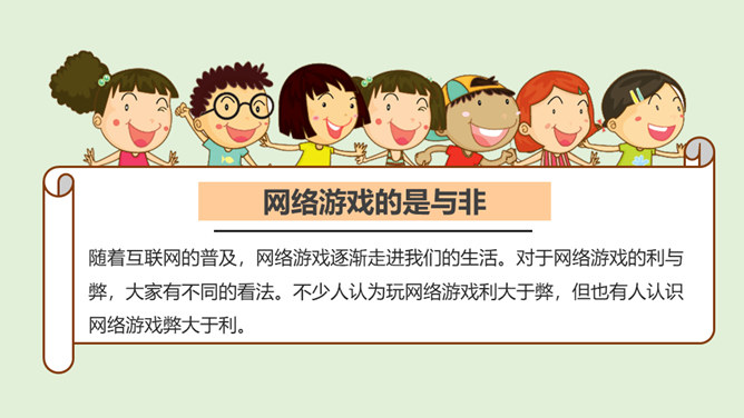 你最喜欢的一款网络游戏是什么?你为什么喜欢它?随着互联网的普及,网络游戏逐渐走进我们的生活。对于网络游戏的利与弊,大家有不同的看法。不少人认为玩网络游戏利大于弊,但也有人认识网络游戏弊大于利。你认为网络游戏是利大于弊,还是弊大于利呢?请你选择自己的立场,并展开辩论。1、网络游戏给故事中的他造成了哪些伤害?2、网络游戏的危害是怎么带来的?我们应该如何避免?偶尔玩一下网络游戏,能起到休息、放松的作用,但沉迷于网络游戏就会给身心带来伤害。所属专题:网络新世界ppt。