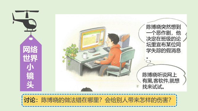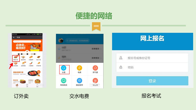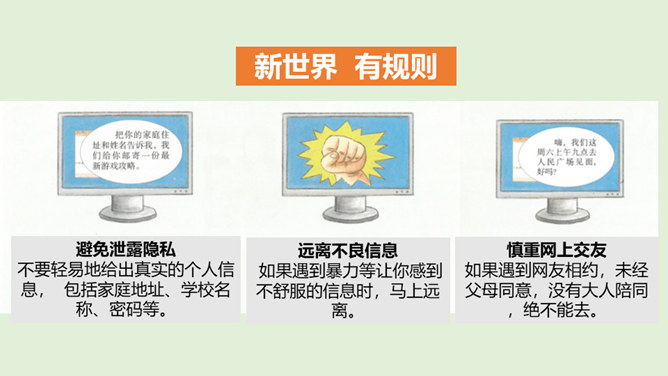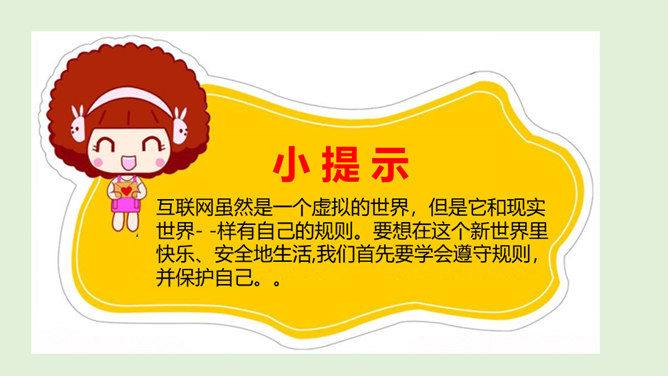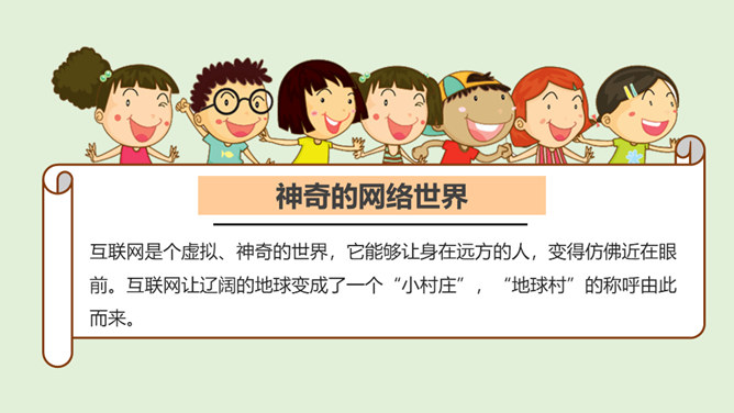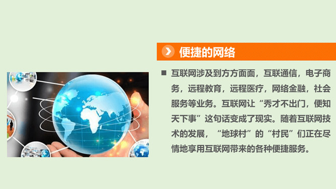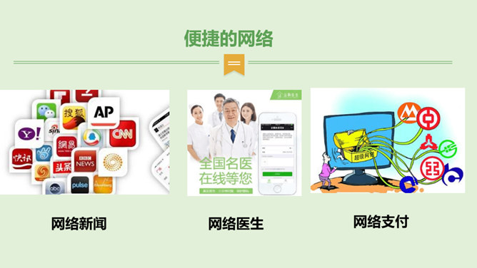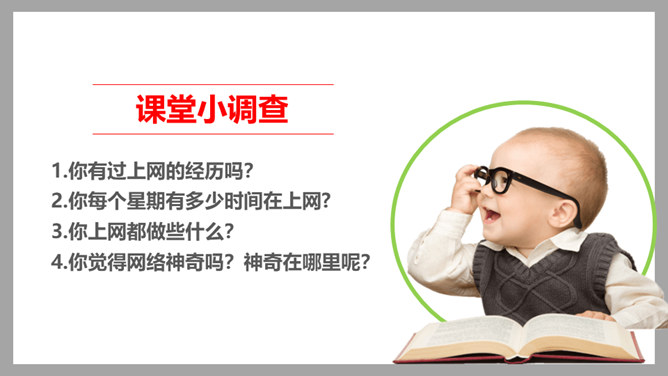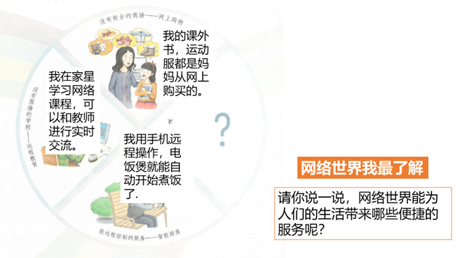 课堂小调查:1.你有过上网的经历吗?2.你每个星期有多少时间在上网?3.你上网都做些什么?4.你觉得网络神奇吗?神奇在哪里呢?请你说一说,网络世界能为人们的生活带来哪些便捷的服务呢?我在家星学习网络课程,可以和教师进行实时交流。我的课外书,运动服都是妈妈从网上购买的。我用手机远程操作,电饭煲就能自动开始煮饭了。现在互联网+制造,互联网+农户等等,老百姓不出门就能利用互联网把自己的农副产品卖到全国各地,不仅节约了时间,更是节约了成本,利用互联网创造出更好经济价值。所属专题:网络新世界ppt。