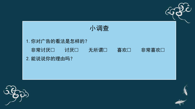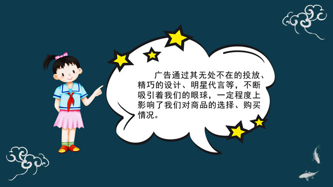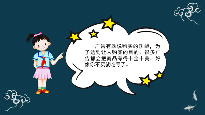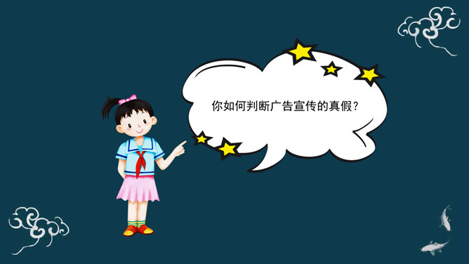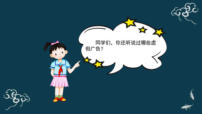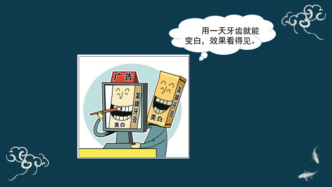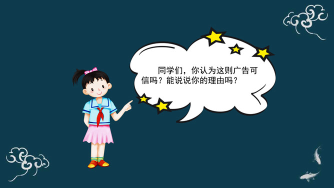 广告有劝说购买的功能,为了达到让人购买的目的,很多广告都会把商品夸得十全十美,好像你不买就吃亏了。你如何判断广告宣传的真假?广告通过其无处不在的投放、精巧的设计、明星代言等,不断吸引着我们的眼球,一定程度上影响了我们对商品的选择、购买情况。同学们,你认为这则广告可信吗?能说说你的理由吗?同学们,你还听说过哪些虚假广告?请同学们边听案例边思考:虚假广告有哪些危害?你能想出破解这些“秘密招数”的方法吗?请给同学们提个醒。所属专题:正确认识广告ppt。