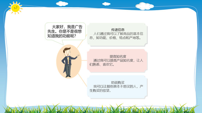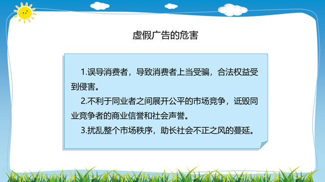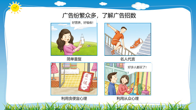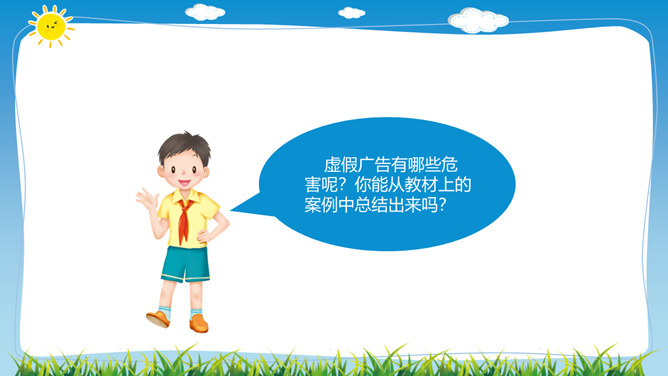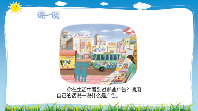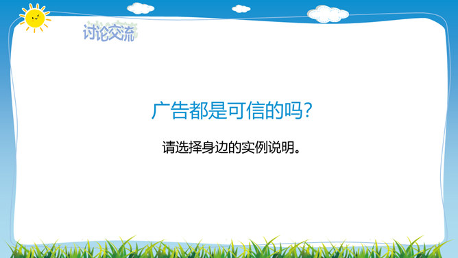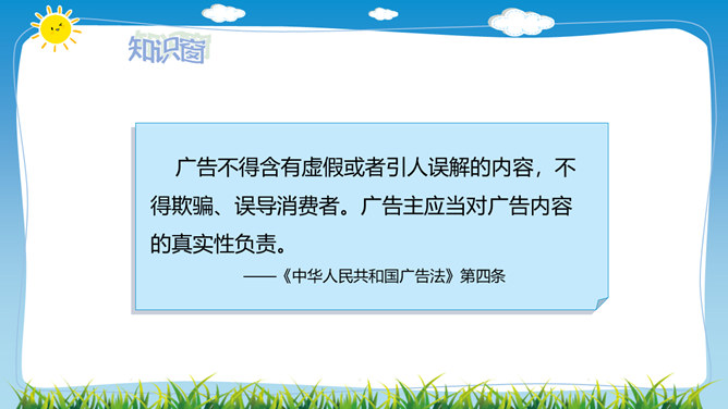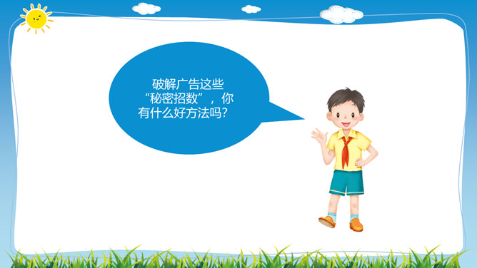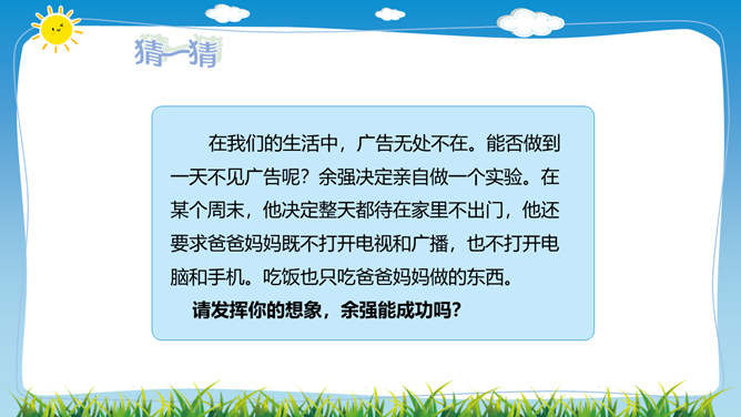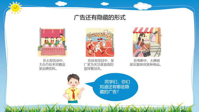活动一:无处不在的广告。你在生活中看到过哪些广告?请用自己的话说一说什么是广告。广告都有哪些存在形式?在大型活动中,主办方给来宾赠送某品牌饮料。在体育项目中,某厂家为关注度很高的篮球赛冠名。在电影中,大牌明星反复使用某种商品。同学们,你们知道还有哪些隐藏的广告?在我们的生活中,广告无处不在。能否做到一天不见广告呢?余强决定亲自做一个实验。在某个周末,他决定整天都待在家里不出门,他还要求爸爸妈妈既不打开电视和广播,也不打开电脑和手机。吃饭也只吃爸爸妈妈做的东西。请发挥你的想象,余强能成功吗?所属专题:正确认识广告ppt。