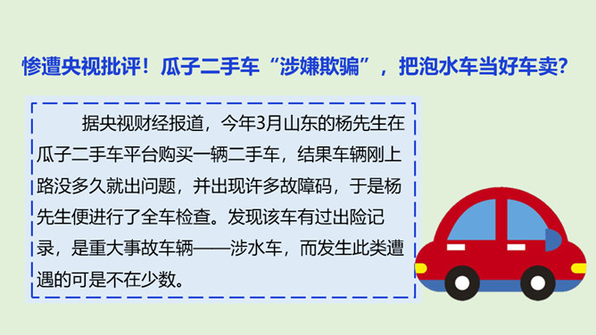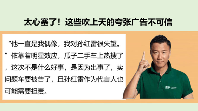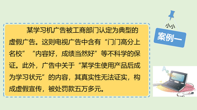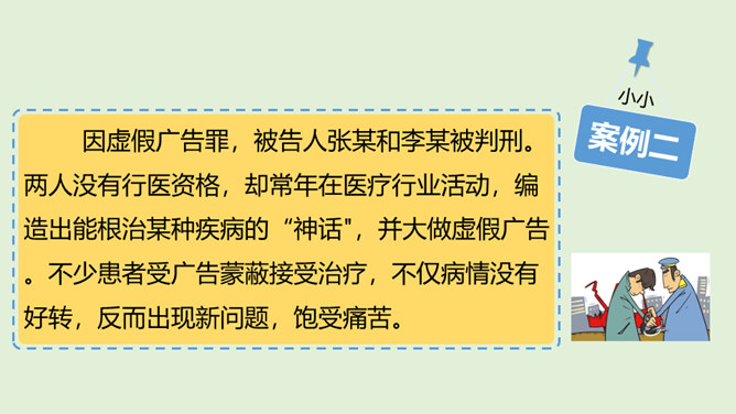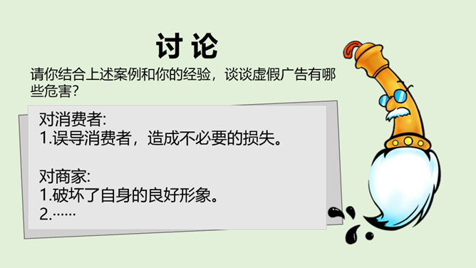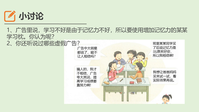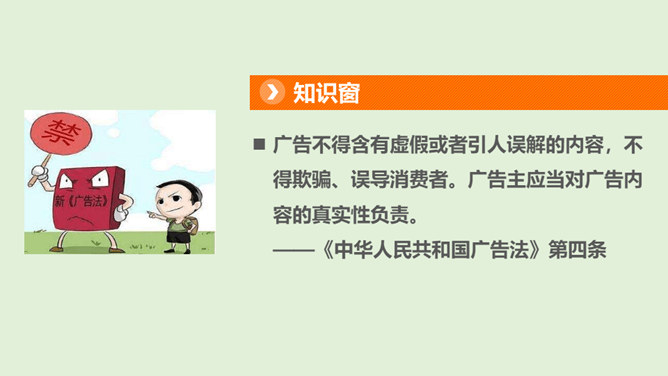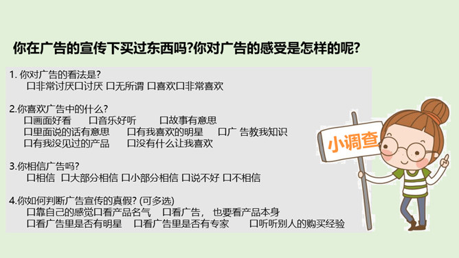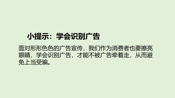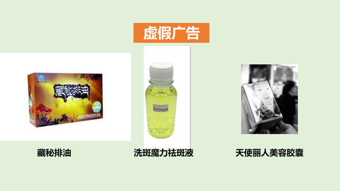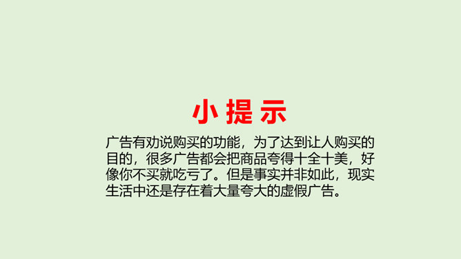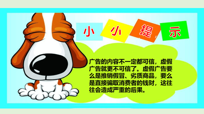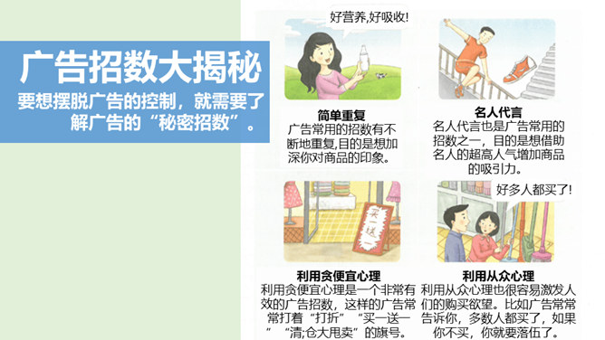 通过调查,你觉得广告对你有什么影响?你买的东西和广告宣传有差距吗?与大家分享你的经历。广告的内容不一定都可信,虚假广告就更不可信了。虚假广告要么是推销假冒、劣质商品,要么是直接骗取消费者的钱财,这往往会造成严重的后果。面对形形色色的广告宣传,我们作为消费者也要擦亮眼睛,学会识别广告,才能不被广告牵着走,从而避免上当受骗。广告招数大揭秘:要想摆脱广告的控制,就需要了解广告的“秘密招数”。广告常用的招数有不断地重复,目的是想加深你对商品的印象。所属专题:正确认识广告ppt。