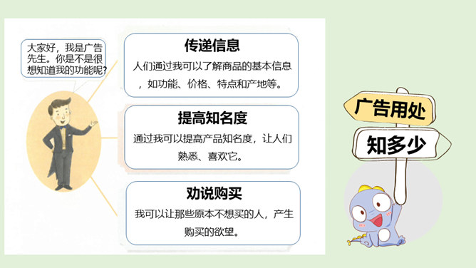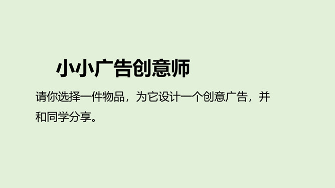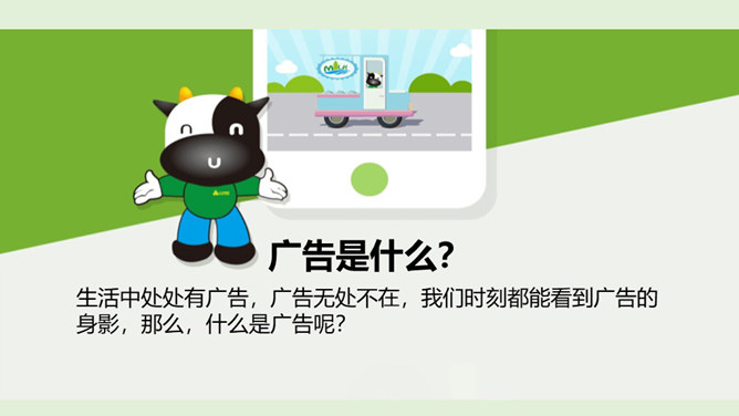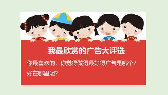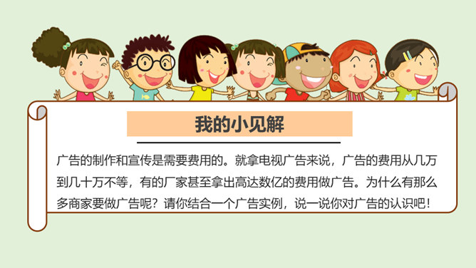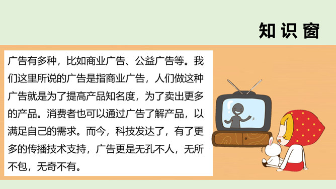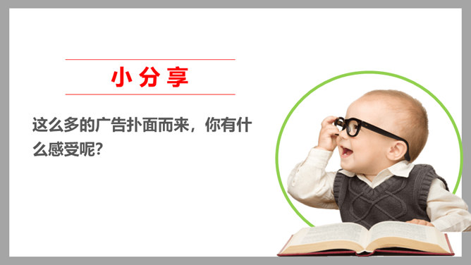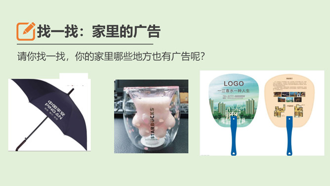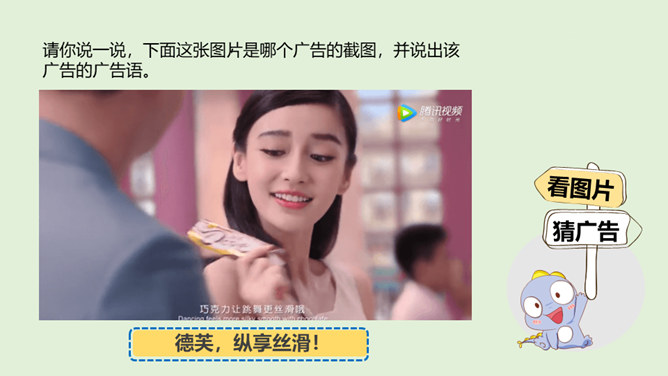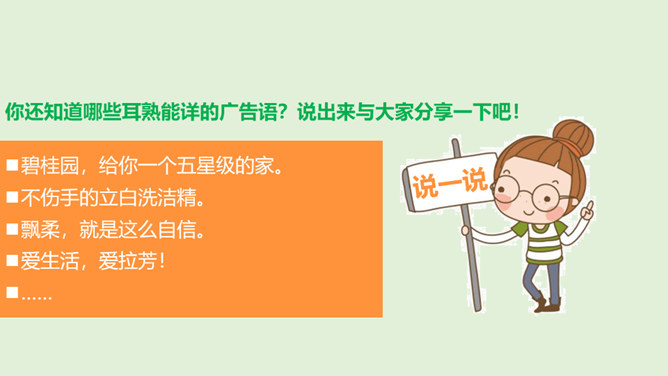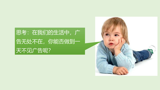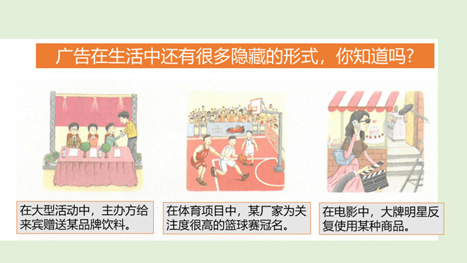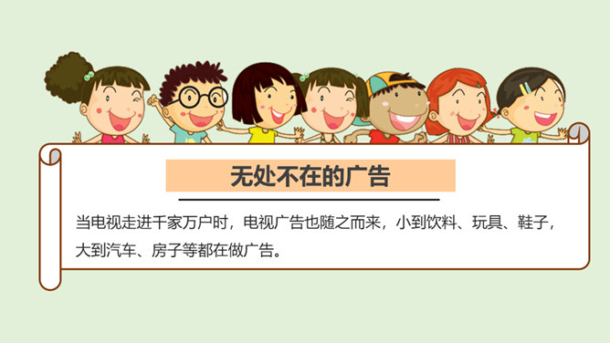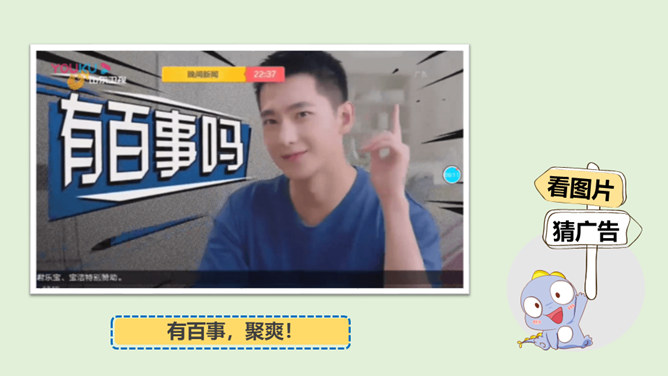 请你说一说,下面这张图片是哪个广告的截图,并说出该广告的广告语。还知道哪些耳熟能详的广告语?说出来与大家分享一下吧!当电视走进千家万户时,电视广告也随之而来,小到饮料、玩具、鞋子,大到汽车、房子等都在做广告。你找一找,你的家里哪些地方也有广告呢?思考:在我们的生活中,广告无处不在,你能否做到一天不见广告呢?广告有多种,比如商业广告、公益广告等。我们这里所说的广告是指商业广告,人们做这种广告就是为了提高产品知名度,为了卖出更多的产品。所属专题:正确认识广告ppt。