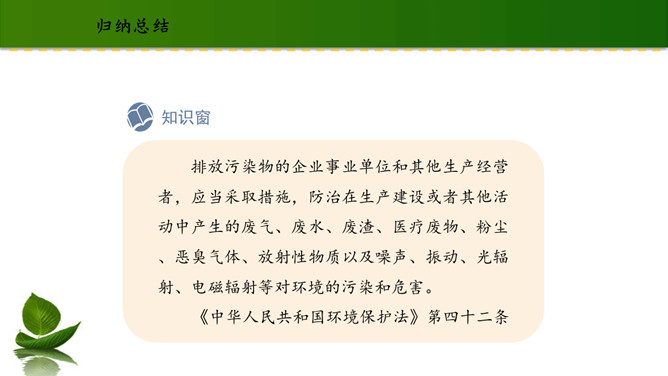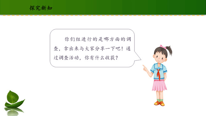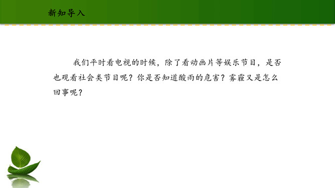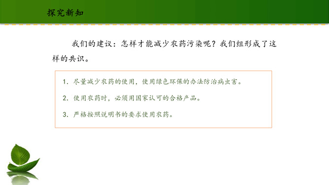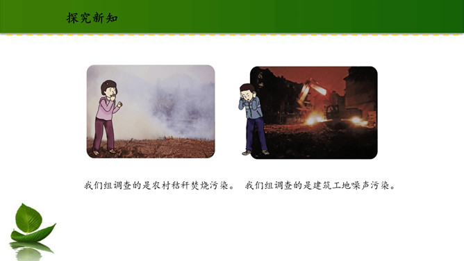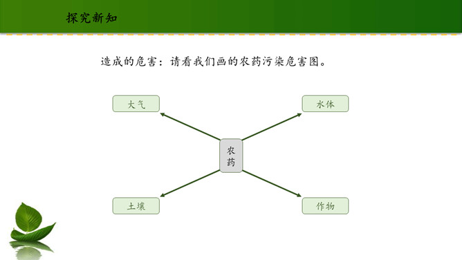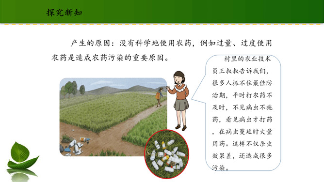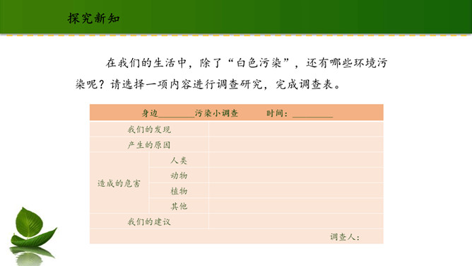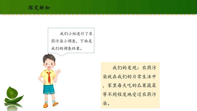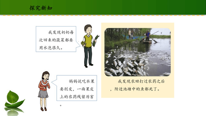 我们平时看电视的时候,除了看动画片等娱乐节目,是否也观看社会类节目呢?你是否知道酸雨的危害?雾霾又是怎么回事呢? 在我们的生活中,除了“白色污染”,还有哪些环境污染呢?请选择一项内容进行调查研究,完成调查表。我们小组进行了农药污染小调查,下面是我们的调查结果。我们的发现:农药污染就在我们的日常生活中,家里每天吃的瓜果蔬菜等不同程度地受过农药污染。我发现奶奶每次回来的蔬菜都要用水泡很久。妈妈说吃水果要削皮,一面果皮上的农药残留厉害。我发现农田打过农药之后,附近池塘中的鱼都死了。所属专题:我们所了解的环境污染ppt。