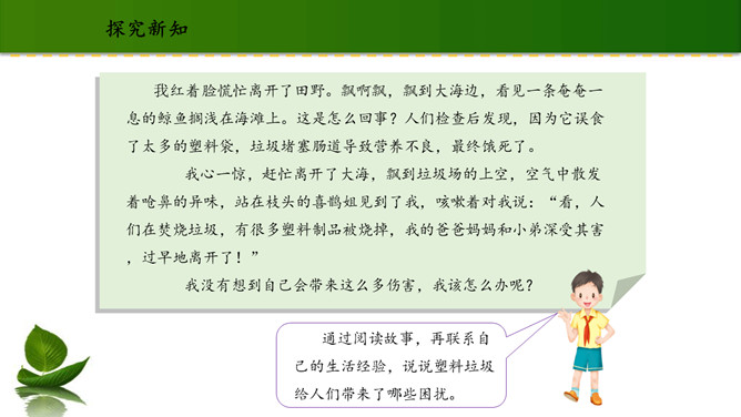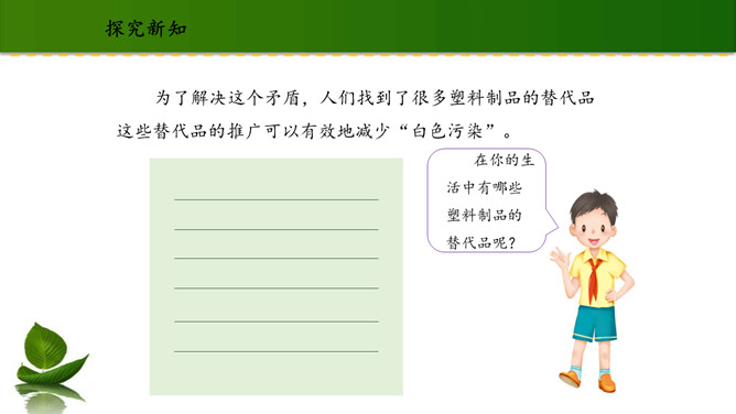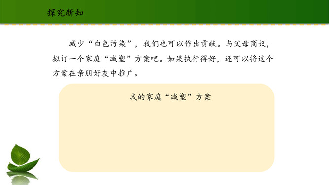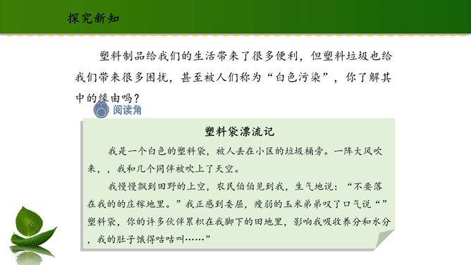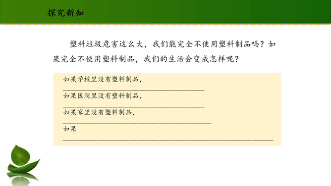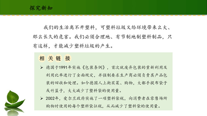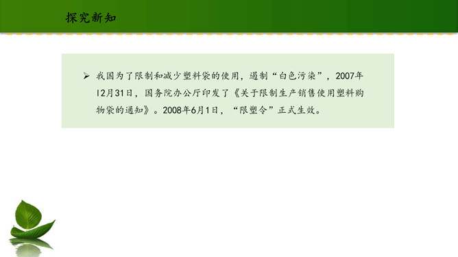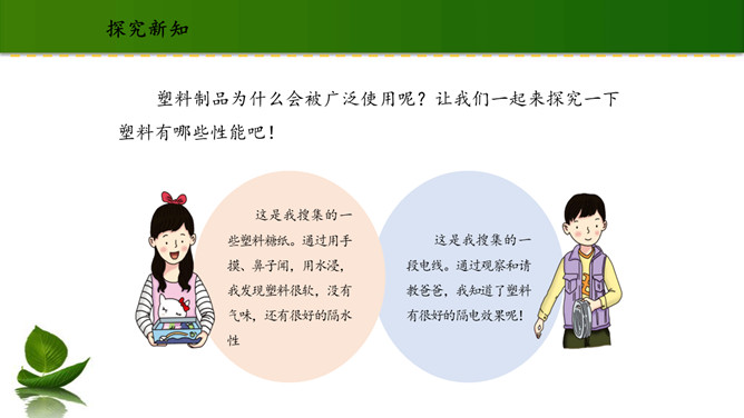 污染是指自然环境中混入了对人类或其他生物有害的物质,其数量或程度达到或超出环境承载力,从而改变环境正常状态的现象。具体包括:水污染、大气污染、噪声污染、放射性污染、重金属污染等。在日常生活中,塑料制品随处可见。你见过哪些塑料制品呢?塑料制品为什么会被广泛使用呢?让我们一起来探究一下塑料有哪些性能吧!这是我搜集的一些塑料糖纸。通过用手摸、鼻子闻,用水浸,我发现塑料很软,没有气味,还有很好的隔水性。这是我搜集的一段电线。通过观察和请教爸爸,我知道了塑料有很好的隔电效果呢!所属专题:我们所了解的环境污染ppt。