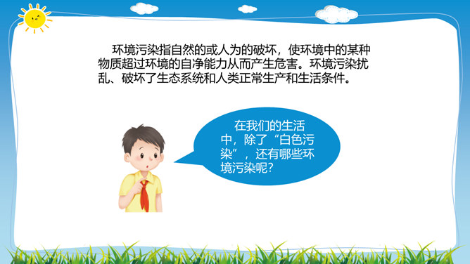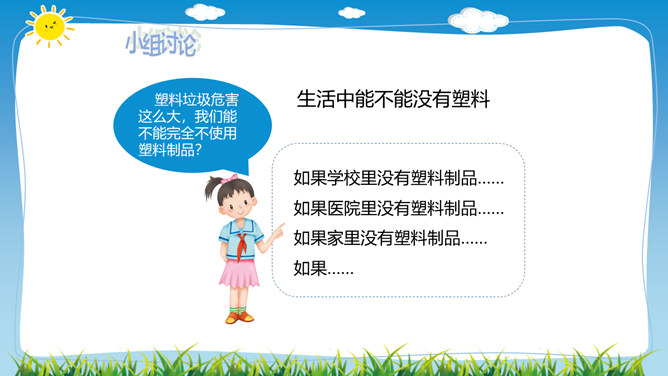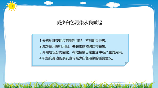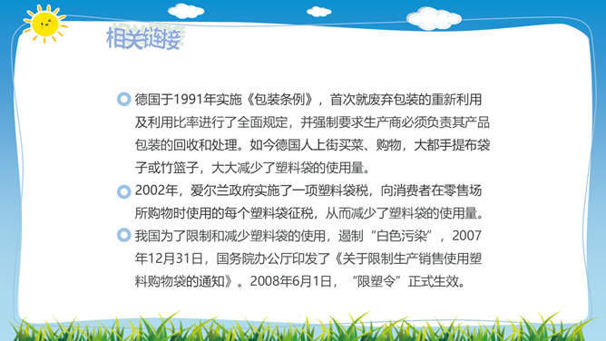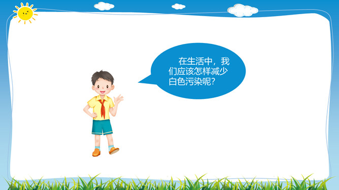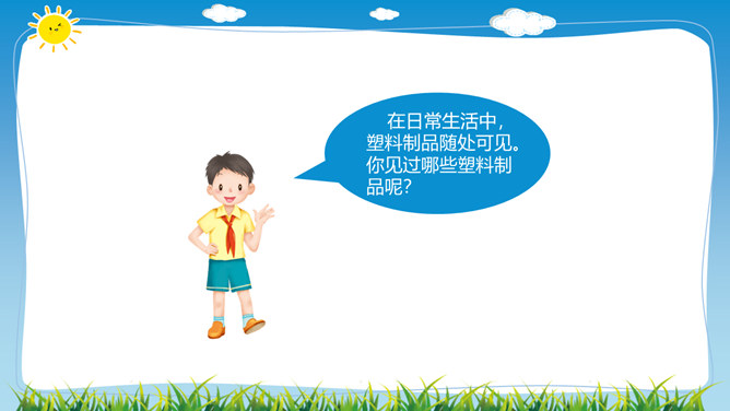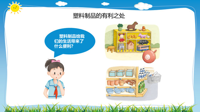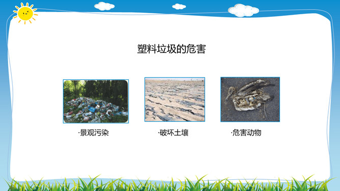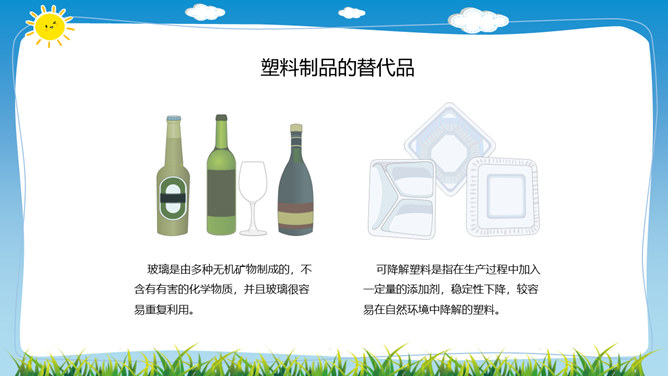 在日常生活中,塑料制品随处可见。你见过哪些塑料制品呢?塑料制品给我们的生活带来了什么便利?塑料垃圾危害这么大,我们能不能完全不使用塑玻璃是由多种无机矿物制成的,不含有有害的化学物质,并且玻璃很容易重复利用。可降解塑料是指在生产过程中加入一定量的添加剂,稳定性下降,较容易在自然环境中降解的塑料。在生活中,我们应该怎样减少白色污染呢?1.妥善处理使用过的塑料用品,不随地丢垃圾。2.减少使用塑料用品,去超市购物时自带布袋。3.开展垃圾分类回收,有效控制日常生活中所产生的污染。所属专题:我们所了解的环境污染ppt。