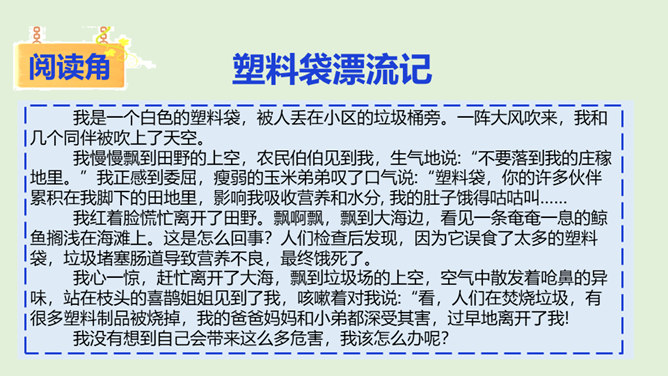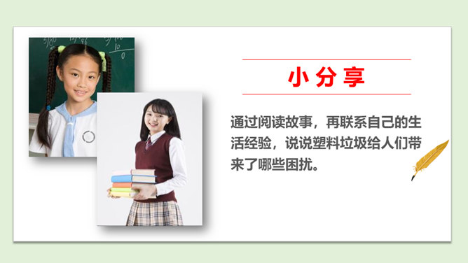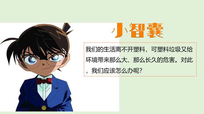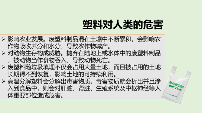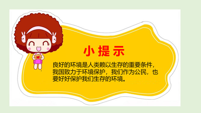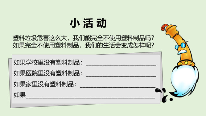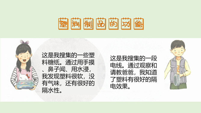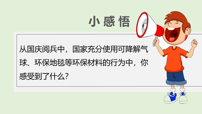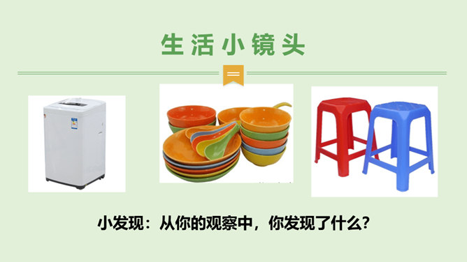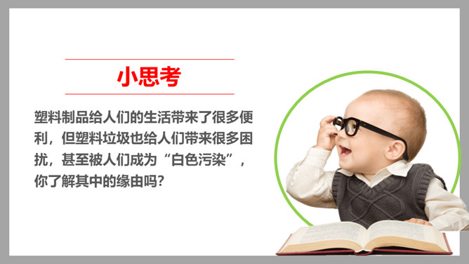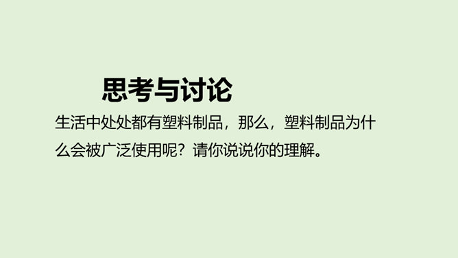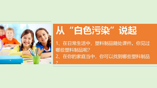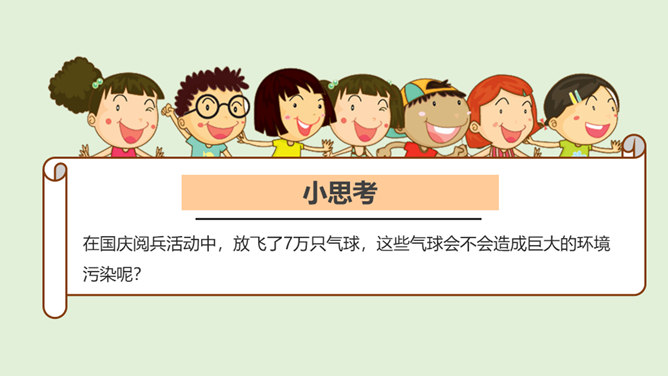 你看国庆阅兵了吗?在整个阅兵式中,你印象最深刻的是什么?在国庆阅兵活动中,放飞了7万只气球,这些气球会不会造成巨大的环境污染呢?从国庆阅兵中,国家充分使用可降解气球、环保地毯等环保材料的行为中,你感受到了什么?良好的环境是人类赖以生存的重要条件,我国致力于环境保护,我们作为公民,也要好好保护我们生存的环境。从“白色污染”说起:1、在日常生活中,塑料制品随处课件。你见过哪些塑料制品呢?2、在你的家庭当中,你可以找到哪些塑料制品?生活中处处都有塑料制品,那么,塑料制品为什么会被广泛使用呢?所属专题:我们所了解的环境污染ppt。