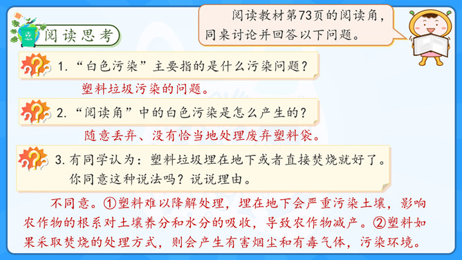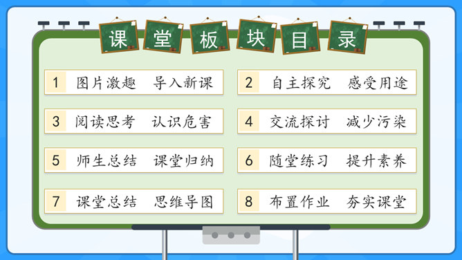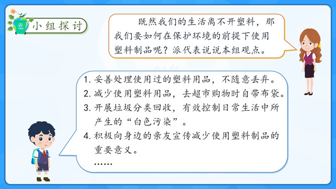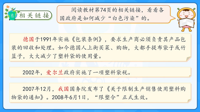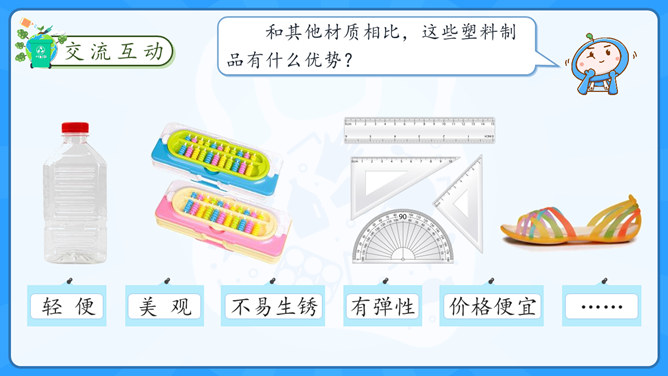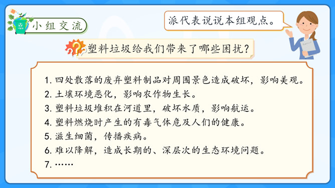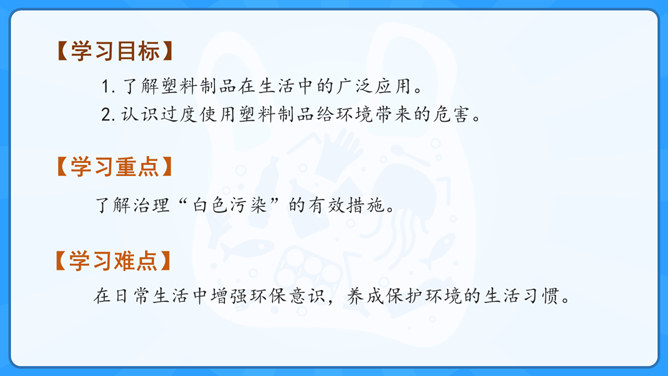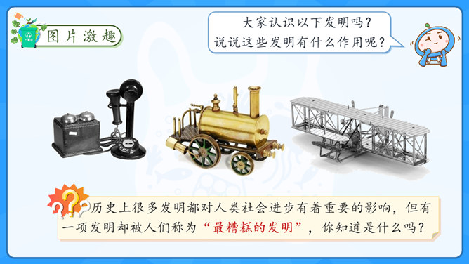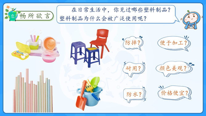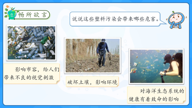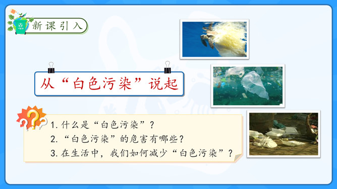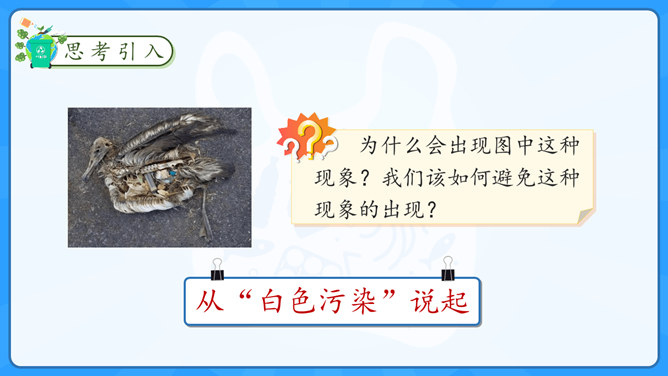 学习目标:1.了解塑料制品在生活中的广泛应用。2.认识过度使用塑料制品给环境带来的危害。学习重点:了解治理“白色污染”的有效措施。学习难点:在日常生活中增强环保意识,养成保护环境的生活习惯。大家认识以下发明吗?说说这些发明有什么作用呢?历史上很多发明都对人类社会进步有着重要的影响,但有一项发明却被人们称为“最糟糕的发明”,你知道是什么吗?为什么会出现图中这种现象?我们该如何避免这种现象的出现?塑料制品为什么会被广泛使用呢?所属专题:我们所了解的环境污染ppt。