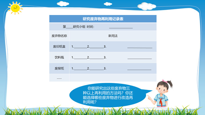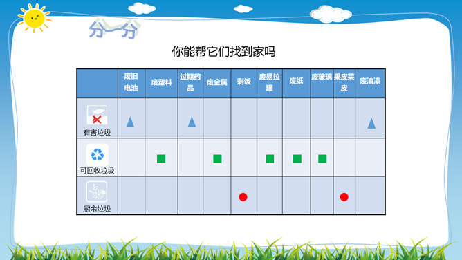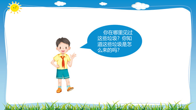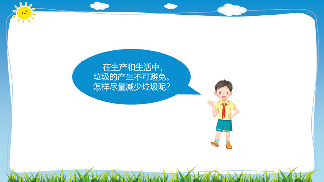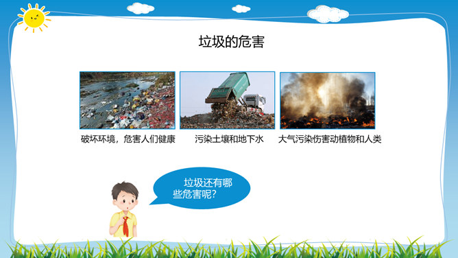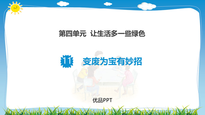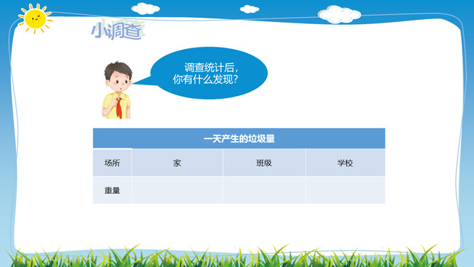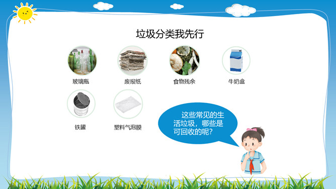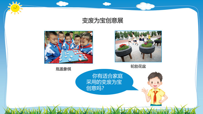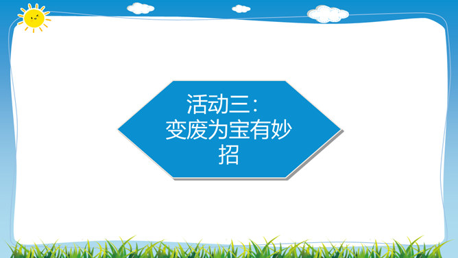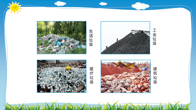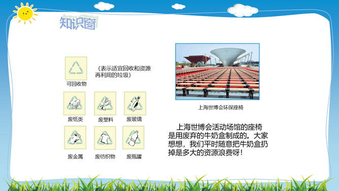 辽阔的草原,蔚蓝的大海,巍峨的高山,广袤的平原……是我们美丽的家园。活动一:暴增的垃圾。你在哪里见过这些垃圾?你知道这些垃圾是怎么来的吗?垃圾还有哪些危害呢?活动二:垃圾分类我先行。在生产和生活中,垃圾的产生不可避免。怎样尽量减少垃圾呢?这些常见的生活垃圾,哪些是可回收的呢?上海世博会活动场馆的座椅是用废弃的牛奶盒制成的。大家想想,我们平时随意把牛奶盒扔掉是多大的资源浪费呀!你能研究出这些废弃物三种以上再利用的方法吗?你还能选择哪些废弃物进行改造再利用呢?所属专题:变废为宝有妙招ppt。