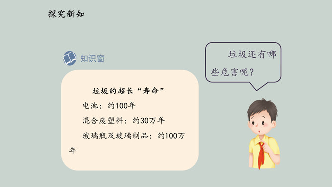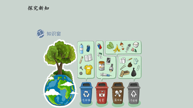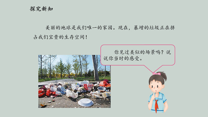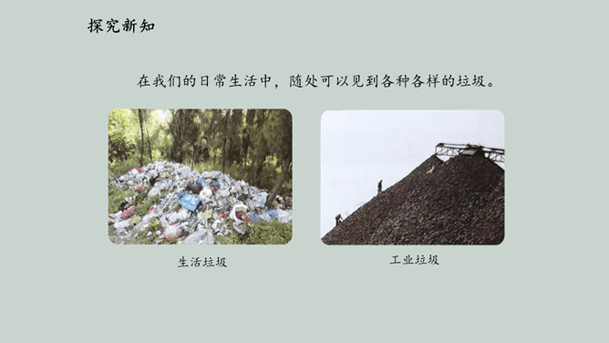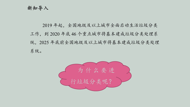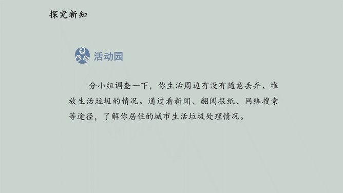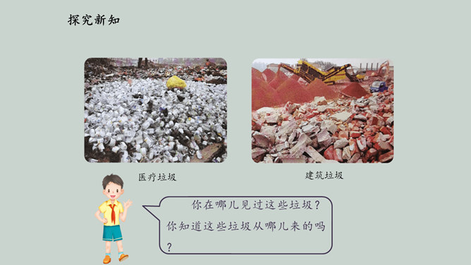 2019 年起,全国地级及以上城市全面启动生活垃圾分类工作,到 2020 年底 46 个重点城市将基本建成垃圾分类处理系统,2025 年底前全国地级及以上城市将基本建成垃圾分类处理系统。为什么要进行垃圾分类呢?在我们的日常生活中,随处可以见到各种各样的垃圾。你在哪儿见过这些垃圾?你知道这些垃圾从哪儿来的吗?分小组调查一下,你生活周边有没有随意丢弃、堆放生活垃圾的情况。通过看新闻、翻阅报纸、网络搜索等途径,了解你居住的城市生活垃圾处理情况。迅速扩大的“垃圾家族”,其危害可不仅仅是挤占我们的生存空间。所属专题:变废为宝有妙招ppt。
