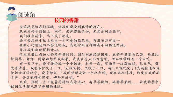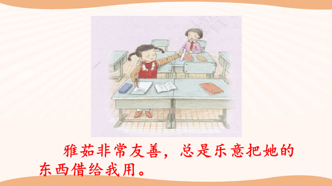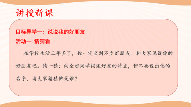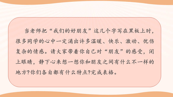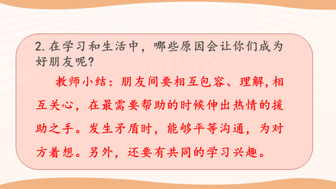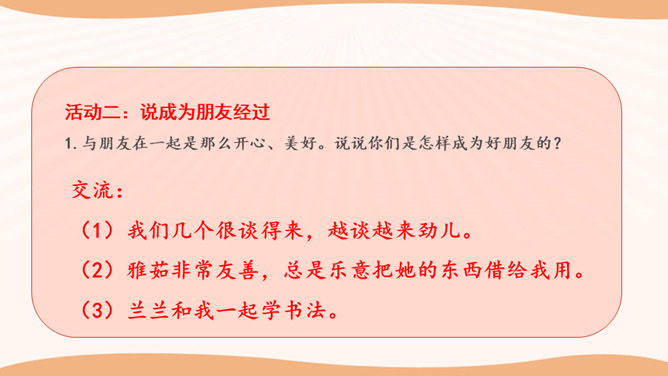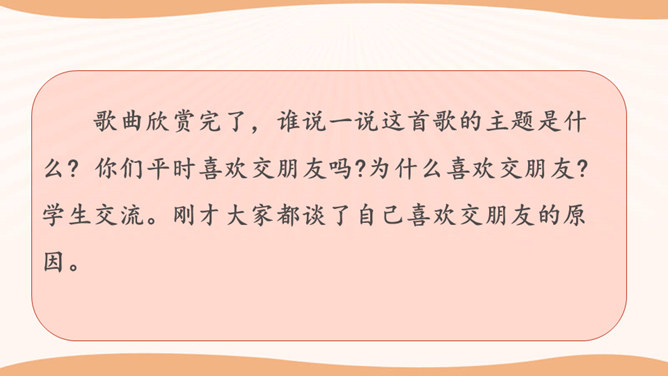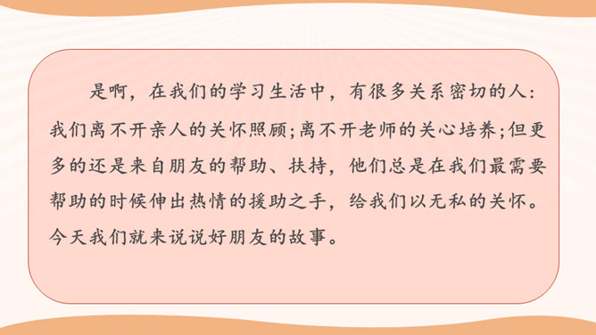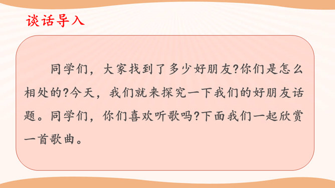 同学们,大家找到了多少好朋友?你们是怎么相处的?今天,我们就来探究一下我们的好朋友话题。同学们,你们喜欢听歌吗?下面我们一起欣赏一首歌曲。 歌曲欣赏完了,谁说一说这首歌的主题是什么? 你们平时喜欢交朋友吗?为什么喜欢交朋友? 学生交流。刚才大家都谈了自己喜欢交朋友的原因。是啊,在我们的学习生活中,有很多关系密切的人:我们离不开亲人的关怀照顾;离不开老师的关心培养;但更多的还是来自朋友的帮助、扶持,他们总是在我们最需要帮助的时候伸出热情的援助之手,给我们以无私的关怀。今天我们就来说说好朋友的故事。所属专题:我们的好朋友ppt。