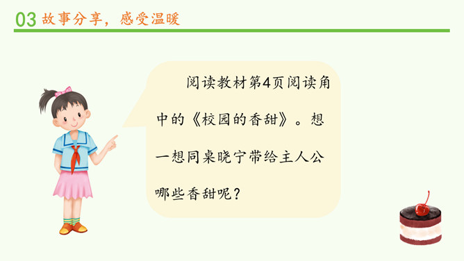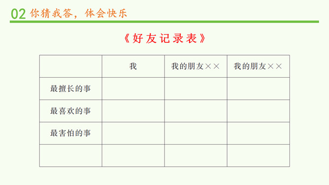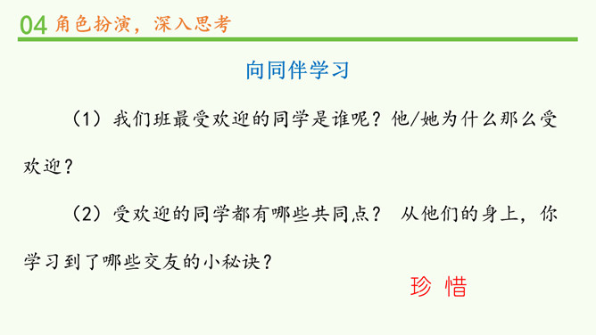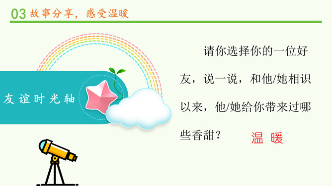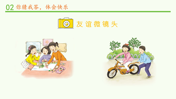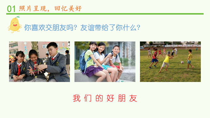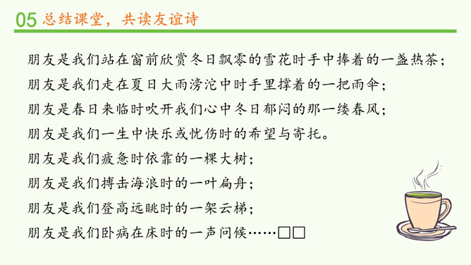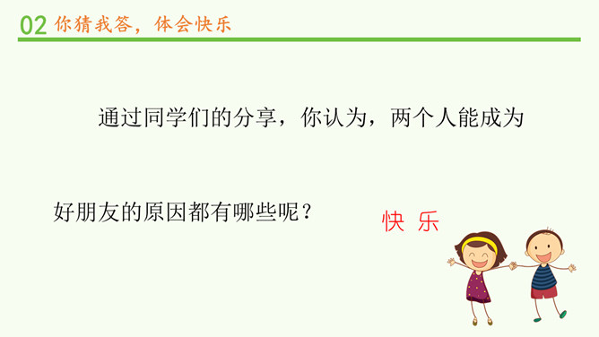 你喜欢交朋友吗? 友谊带给了你什么?通过同学们的分享,你认为,两个人能成为好朋友的原因都有哪些呢?请你选择你的一位好友,说一说,和他/她相识以来,他/她给你带来过哪些香甜?(1)我们班最受欢迎的同学是谁呢?他/她为什么那么受欢迎?(2)受欢迎的同学都有哪些共同点? 从他们的身上,你学习到了哪些交友的小秘诀?朋友是我们站在窗前欣赏冬日飘零的雪花时手中捧着的一盏热茶; 朋友是我们走在夏日大雨滂沱中时手里撑着的一把雨伞; 朋友是春日来临时吹开我们心中冬日郁闷的那一缕春风。所属专题:我们的好朋友ppt。