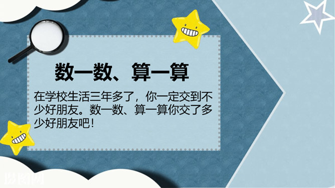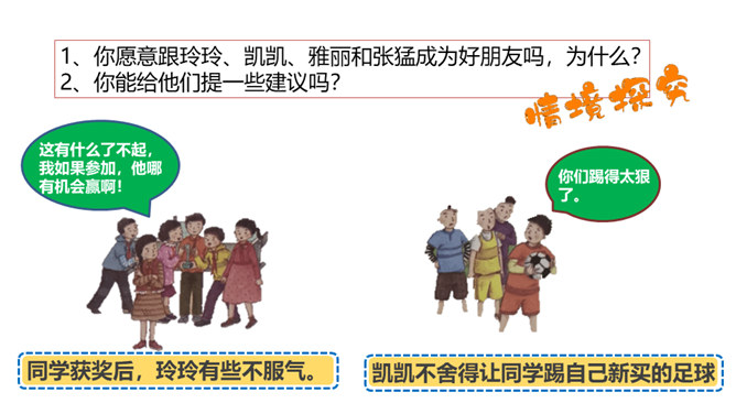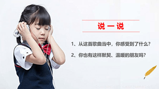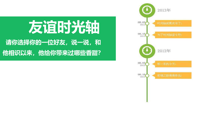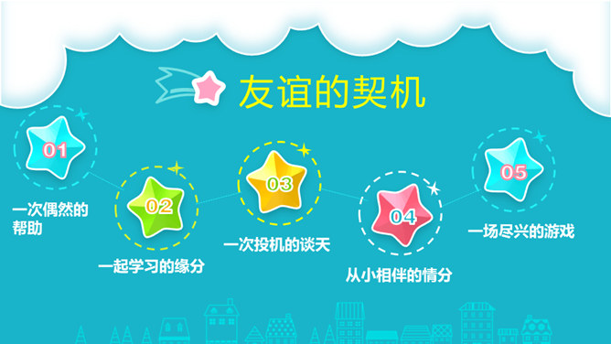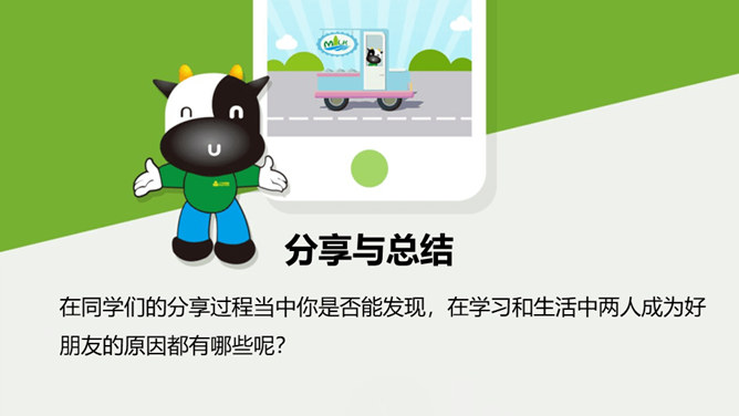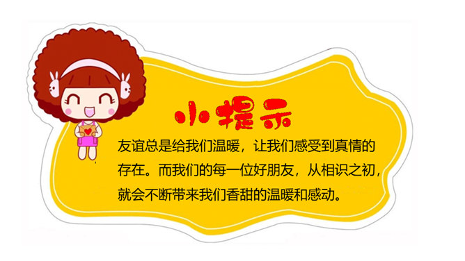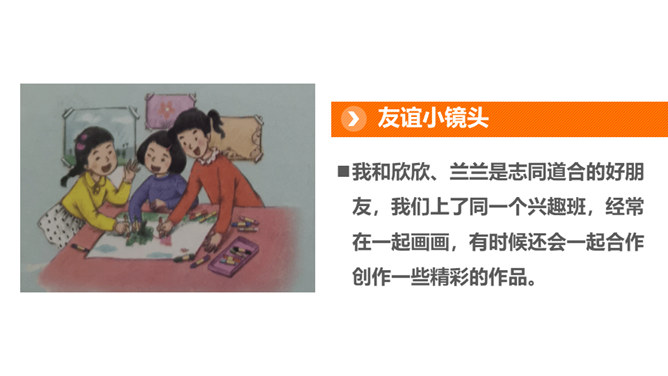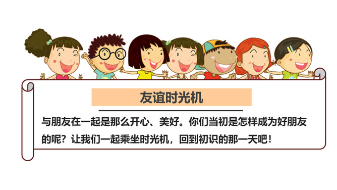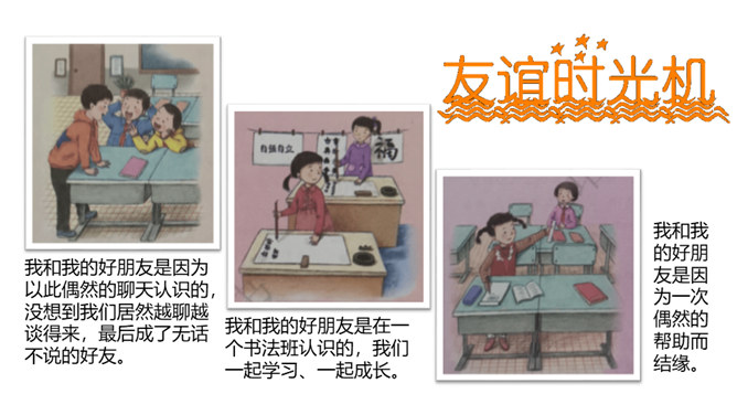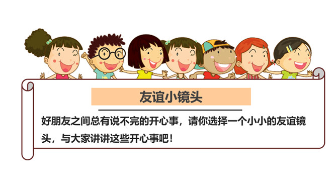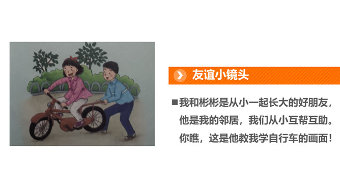 好朋友之间总有说不完的开心事,请你选择一个小小的友谊镜头,与大家讲讲这些开心事吧!我和欣欣、兰兰是志同道合的好朋友,我们上了同一个兴趣班,经常在一起画画,有时候还会一起合作创作一些精彩的作品。我和彬彬是从小一起长大的好朋友,他是我的邻居,我们从小互帮互助。你瞧,这是他教我学自行车的画面!与朋友在一起是那么开心、美好。你们当初是怎样成为好朋友的呢?让我们一起乘坐时光机,回到初识的那一天吧!在同学们的分享过程当中你是否能发现,在学习和生活中两人成为好朋友的原因都有哪些呢?所属专题:我们的好朋友ppt。