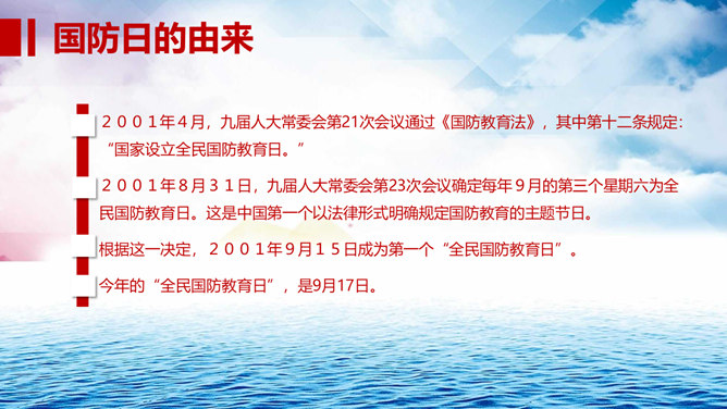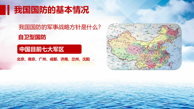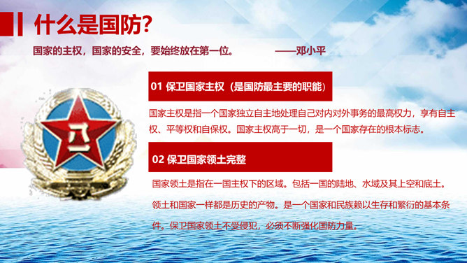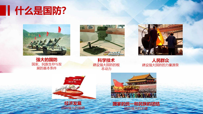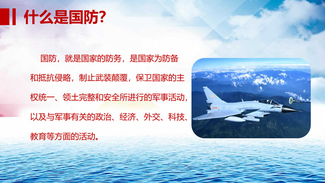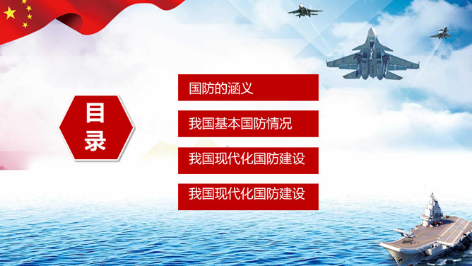 中小学国防教育主题班会PPT模板。包括国防的涵义、我国基本国防情况、我国现代化国防建设、我国国防事业的发展历程。