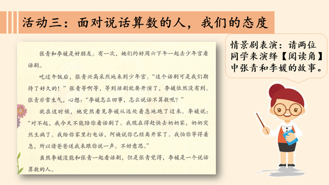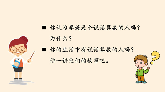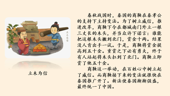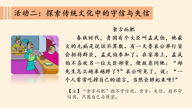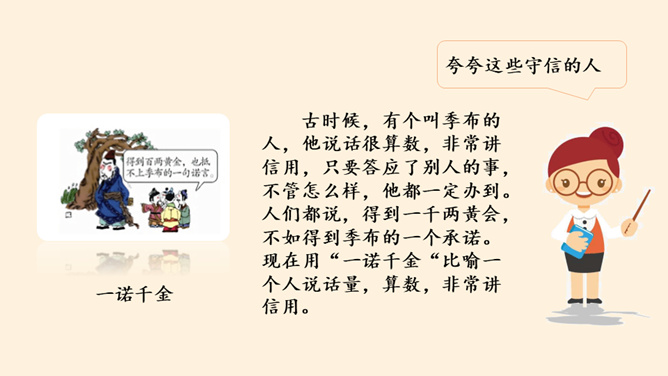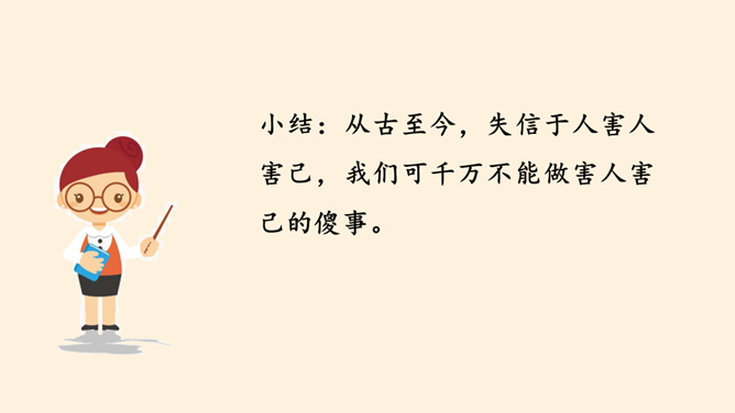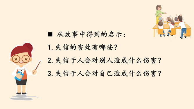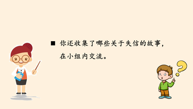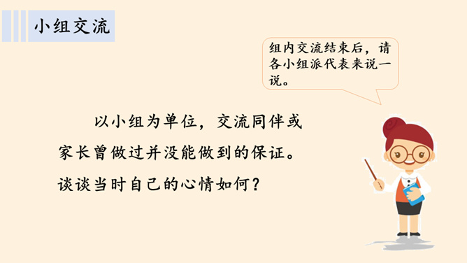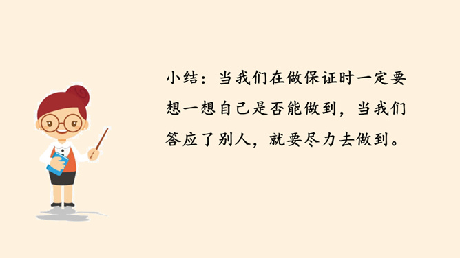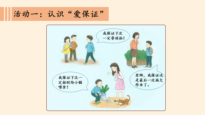 我保证下次一定带球拍!我保证下次一定按时给小猫喂食!老师,我保证这是最后一次拖欠作业了。你们发现了什么?他是一个怎样的人?如果你是他的同学、老师、家长,你想对他说些什么?以小组为单位,交流同伴或家长曾做过并没能做到的保证。谈谈当时自己的心情如何?组内交流结束后,请各小组派代表来说一说。小结:当我们在做保证时一定要想一想自己是否能做到,当我们答应了别人,就要尽力去做到。你还收集了哪些关于失信的故事,在小组内交流。从古至今,失信于人害人害己,我们可千万不能做害人害己的傻事。所属专题:说话要算数ppt。