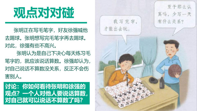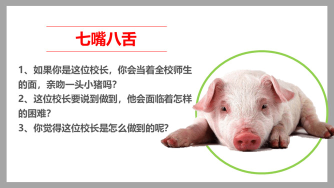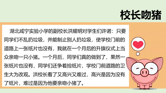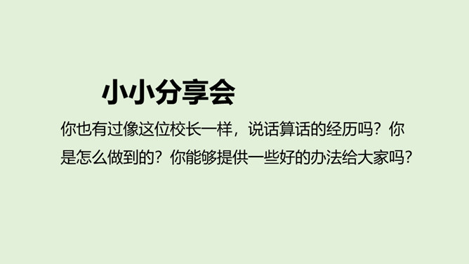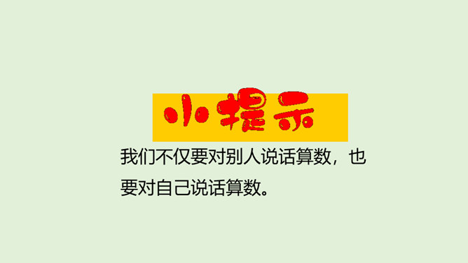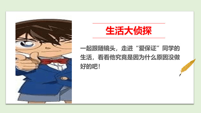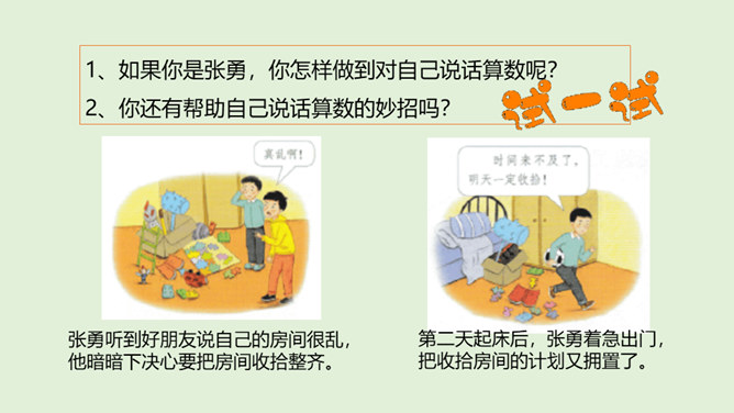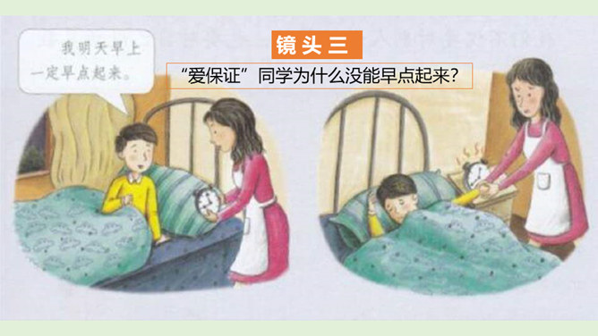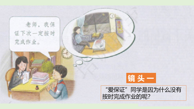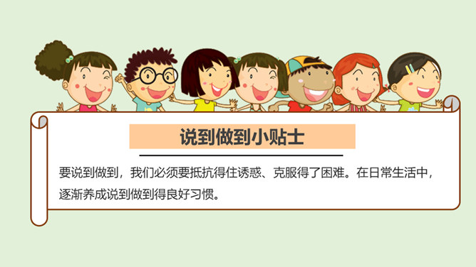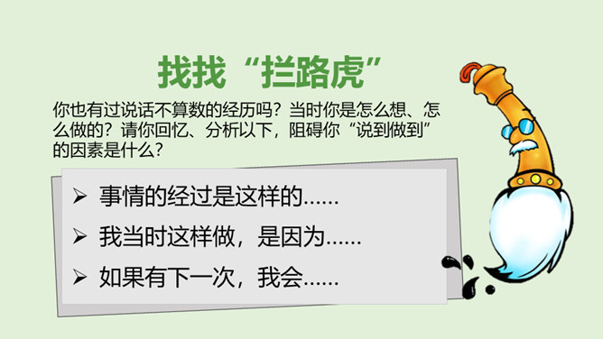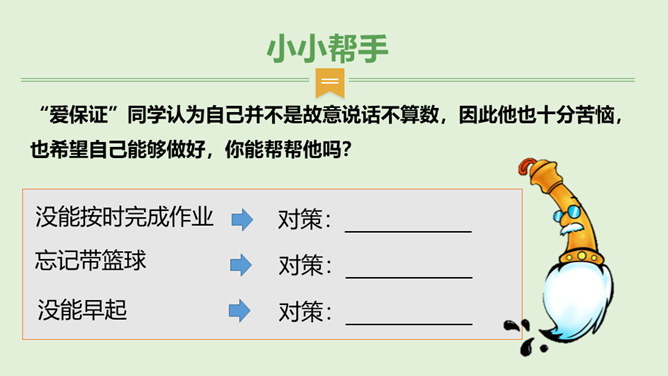 一起跟随镜头,走进“爱保证”同学的生活,看看他究竟是因为什么原因没做好的吧!“爱保证”同学是因为什么没有按时完成作业的呢?“爱保证”同学是什么原因没有带篮球呢?“爱保证”同学为什么没能早点起来?“爱保证”同学认为自己并不是故意说话不算数,因此他也十分苦恼,也希望自己能够做好,你能帮帮他吗?你也有过说话不算数的经历吗?当时你是怎么想、怎么做的?请你回忆、分析以下,阻碍你“说到做到”的因素是什么?你也有过像这位校长一样,说话算话的经历吗?你是怎么做到的?所属专题:说话要算数ppt。