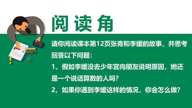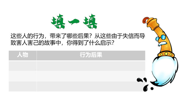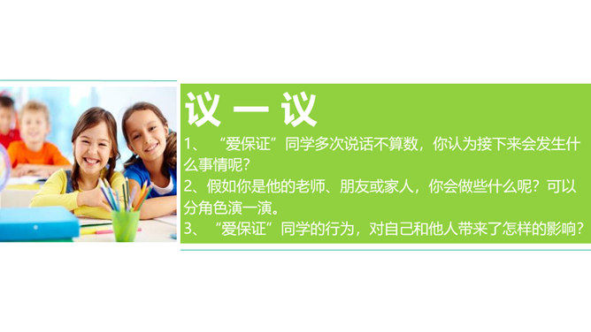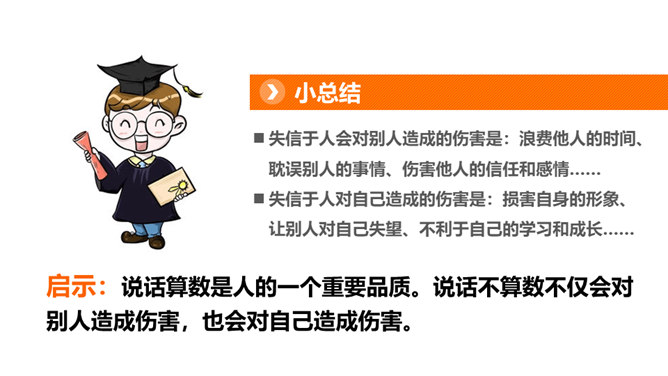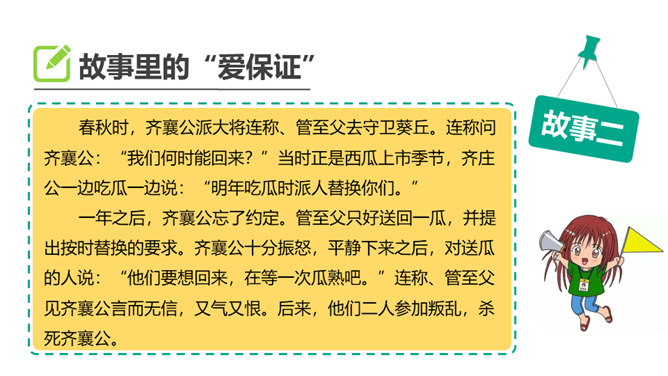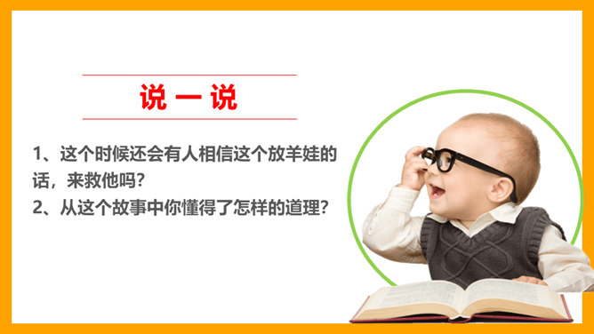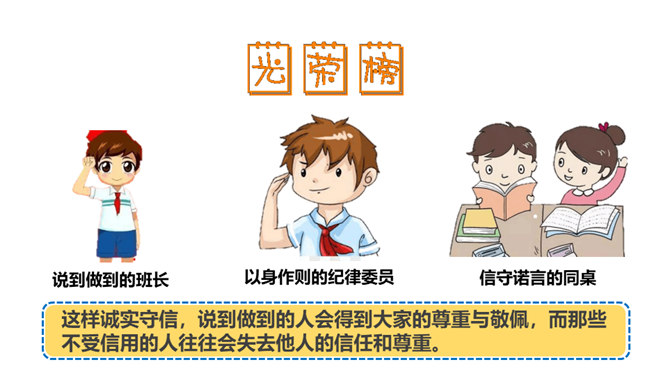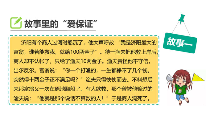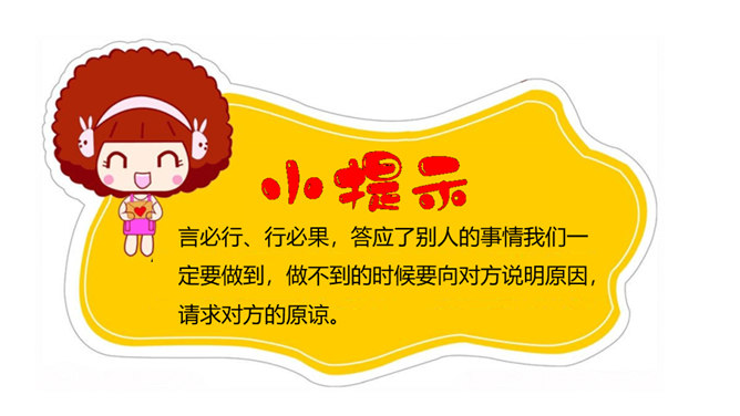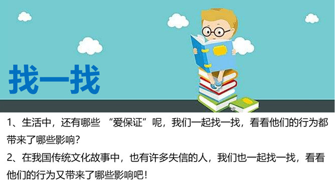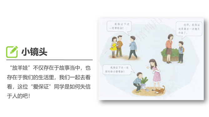 如果一个人总是撒谎,就不会再有人相信他的话。尽管最后他说的是真话,也不会有人愿意相信了。“放羊娃”不仅存在于故事当中,也存在于我们的生活里,我们一起去看看,这位“爱保证”同学是如何失信于人的吧!“爱保证”同学多次说话不算数,你认为接下来会发生什么事情呢?假如你是他的老师、朋友或家人,你会做些什么呢?可以分角色演一演。“爱保证”同学的行为,对自己和他人带来了怎样的影响?在我国传统文化故事中,也有许多失信的人,我们也一起找一找,看看他们的行为又带来了哪些影响吧!所属专题:说话要算数ppt。