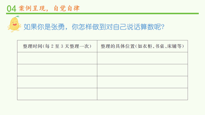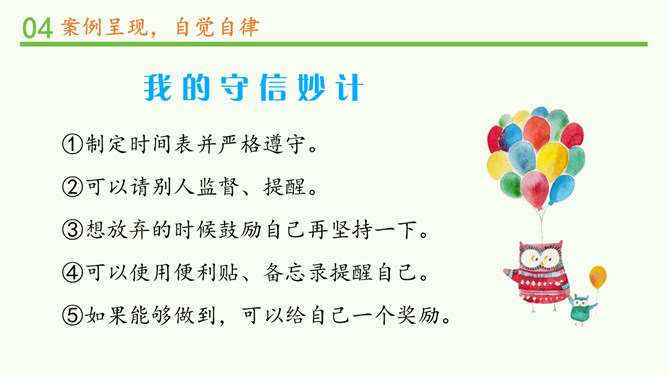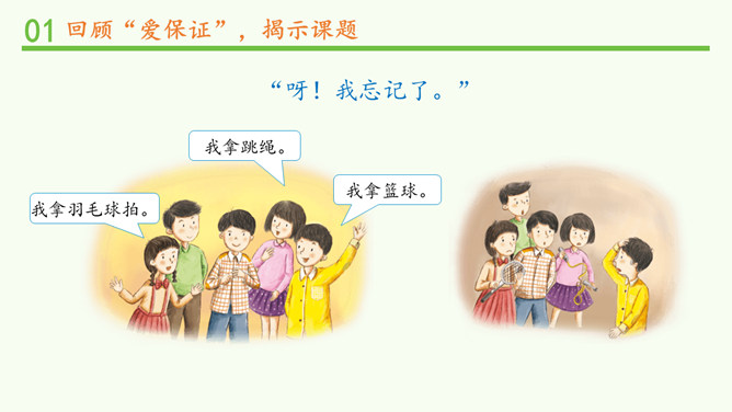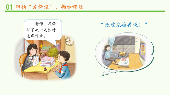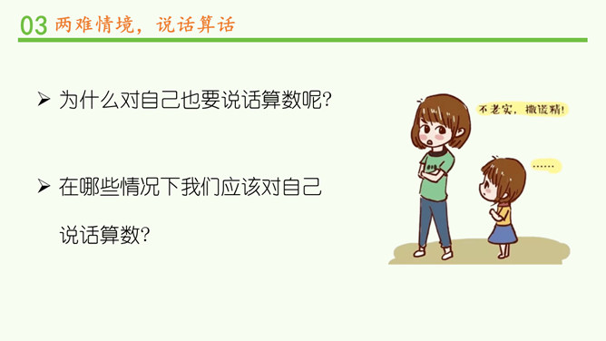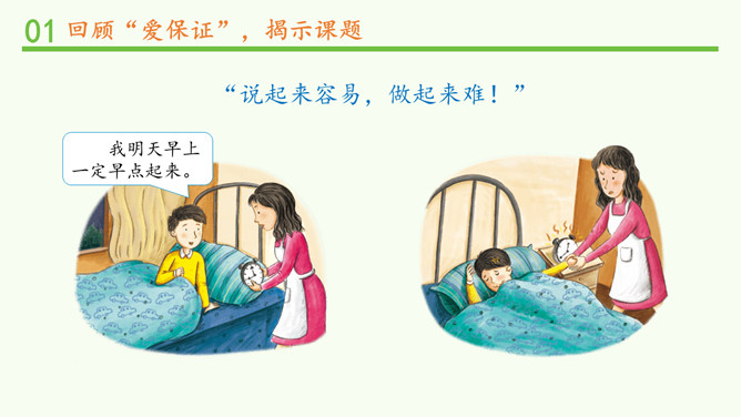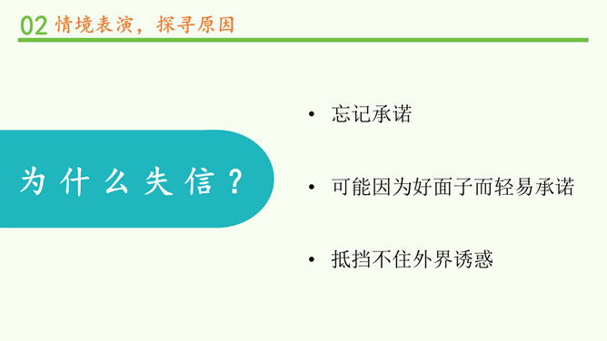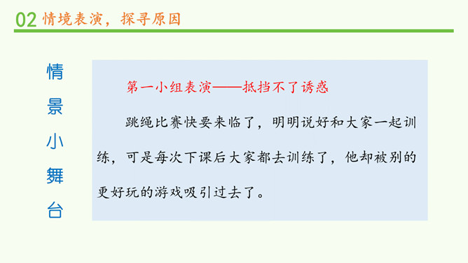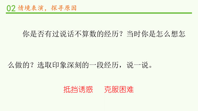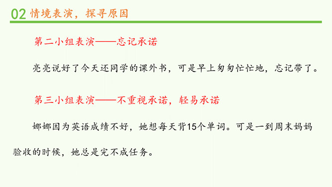 第一小组表演——抵挡不了诱惑:跳绳比赛快要来临了,明明说好和大家一起训练,可是每次下课后大家都去训练了,他却被别的更好玩的游戏吸引过去了。第二小组表演——忘记承诺:亮亮说好了今天还同学的课外书,可是早上匆匆忙忙地,忘记带了。第三小组表演——不重视承诺,轻易承诺:娜娜因为英语成绩不好,她想每天背15个单词。可是一到周末妈妈验收的时候,她总是完不成任务。你是否有过说话不算数的经历?当时你是怎么想怎么做的?选取印象深刻的一段经历,说一说。所属专题:说话要算数ppt。