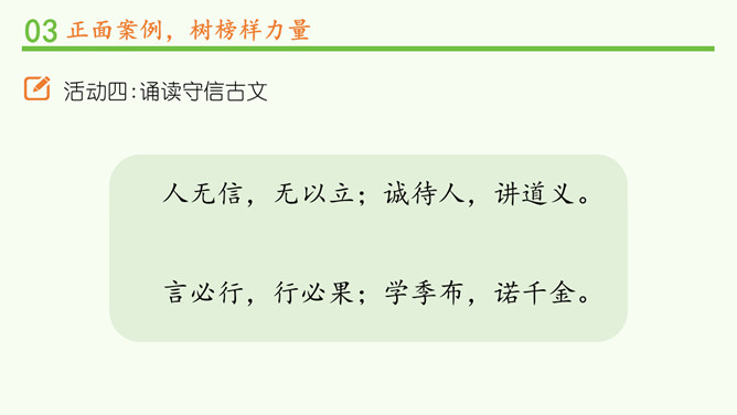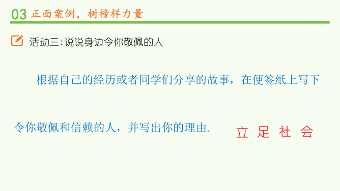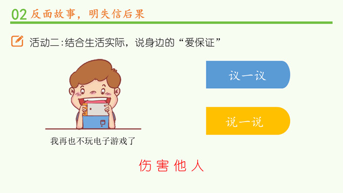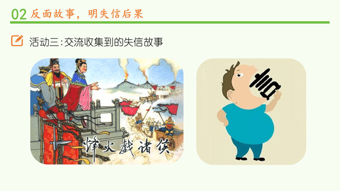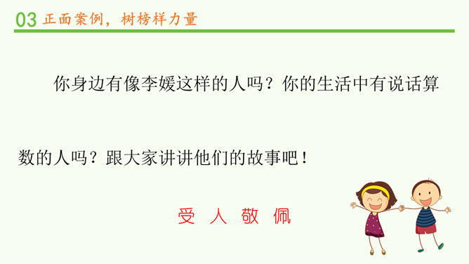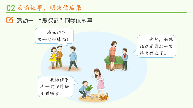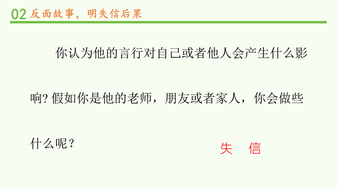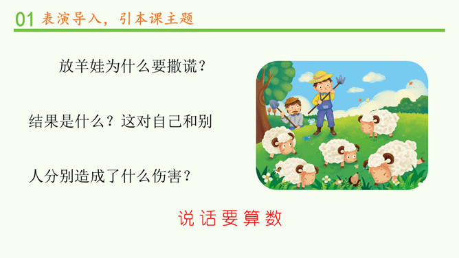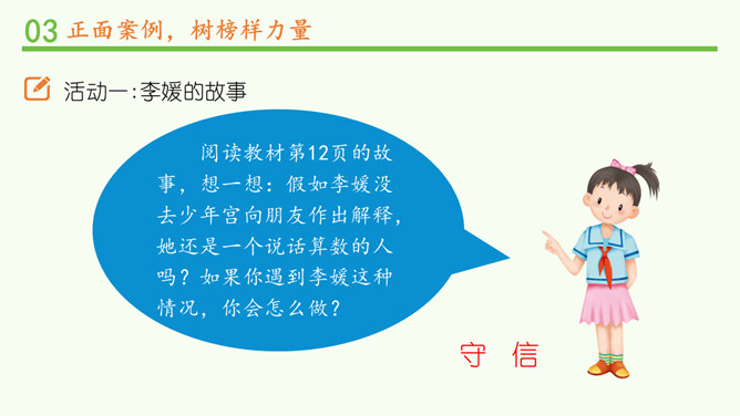 放羊娃为什么要撒谎?结果是什么?这对自己和别人分别造成了什么伤害?你认为他的言行对自己或者他人会产生什么影响? 假如你是他的老师,朋友或者家人,你会做些什么呢?阅读教材第12页的故事,想一想:假如李媛没去少年宫向朋友作出解释,她还是一个说话算数的人吗?如果你遇到李媛这种情况,你会怎么做?你身边有像李媛这样的人吗?你的生活中有说话算数的人吗?跟大家讲讲他们的故事吧!根据自己的经历或者同学们分享的故事,在便签纸上写下令你敬佩和信赖的人,并写出你的理由。所属专题:说话要算数ppt。