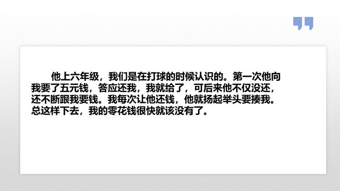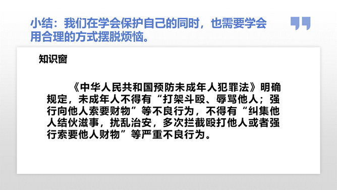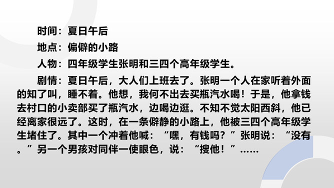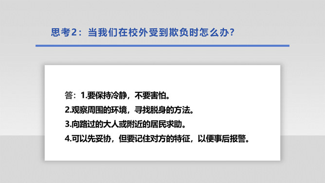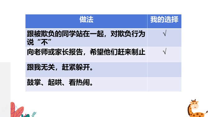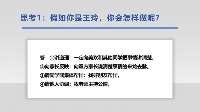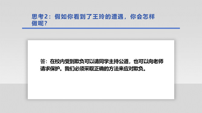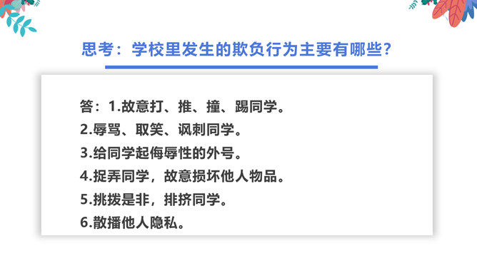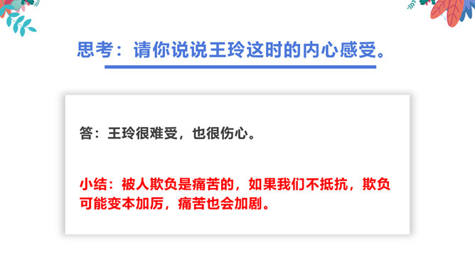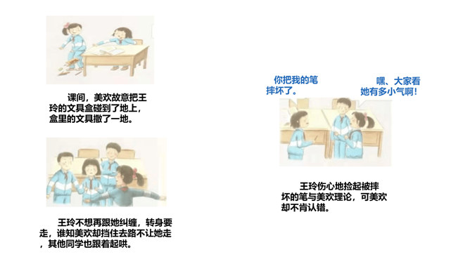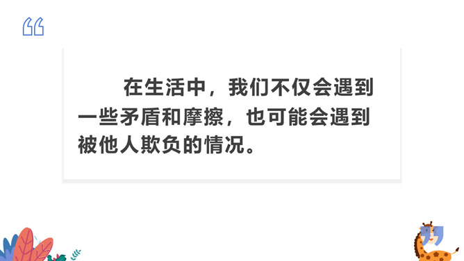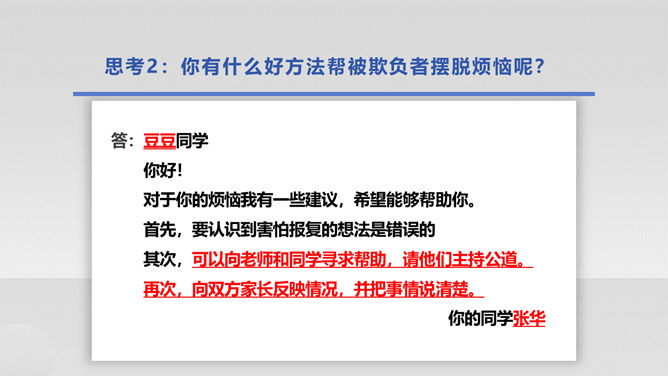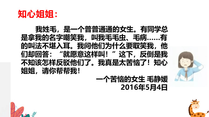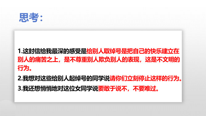 在生活中,我们不仅会遇到一些矛盾和摩擦,也可能会遇到被他人欺负的情况。这封信给我最深的感受是给别人取绰号是把自己的快乐建立在别人的痛苦之上,是不尊重别人欺负别人的表现,这是不文明的行为。我想对这些给别人起绰号的同学说请你们立刻停止这样的行为。我还想悄悄地对这位女同学说要敢于说不,不要难过。思考:学校里发生的欺负行为主要有哪些?答:1.故意打、推、撞、踢同学。2.辱骂、取笑、讽刺同学。3.给同学起侮辱性的外号。4.捉弄同学,故意损坏他人物品。5.挑拨是非,排挤同学。6.散播他人隐私。所属专题:当冲突发生ppt。