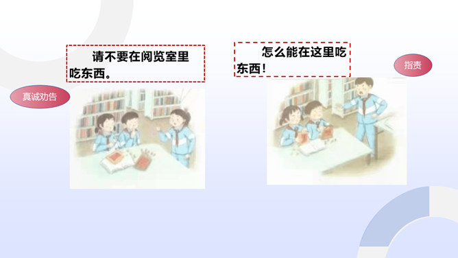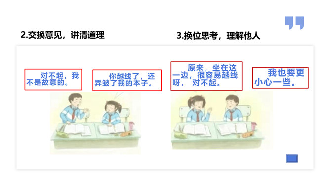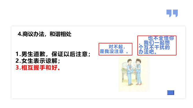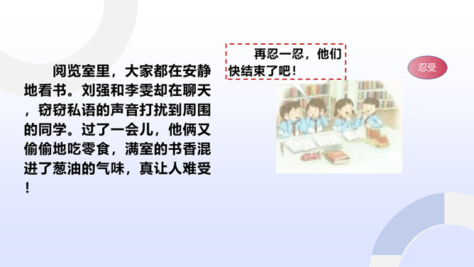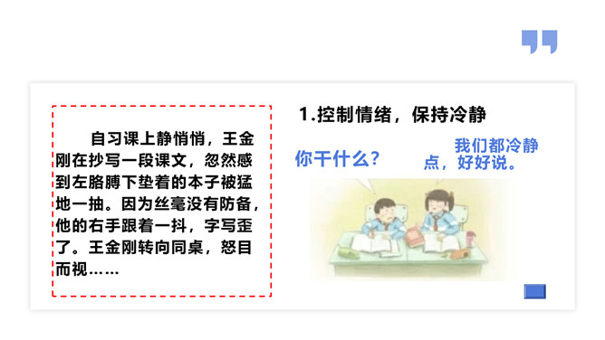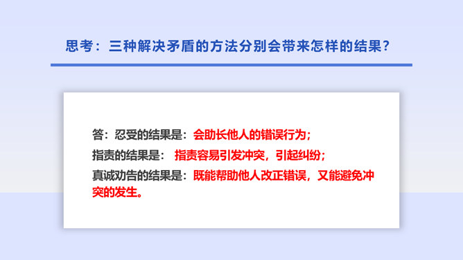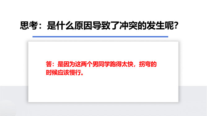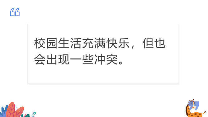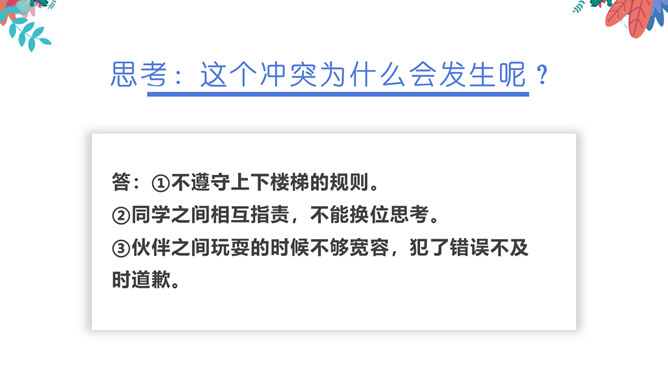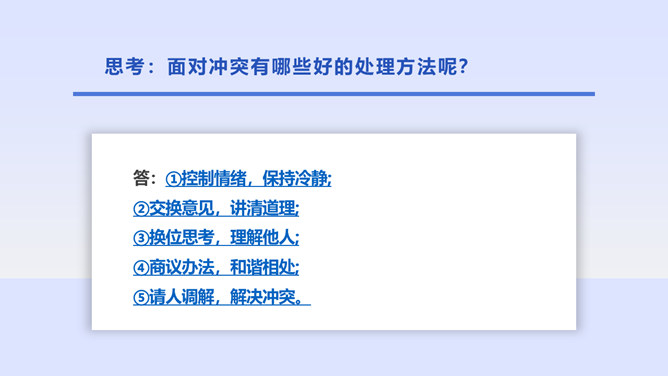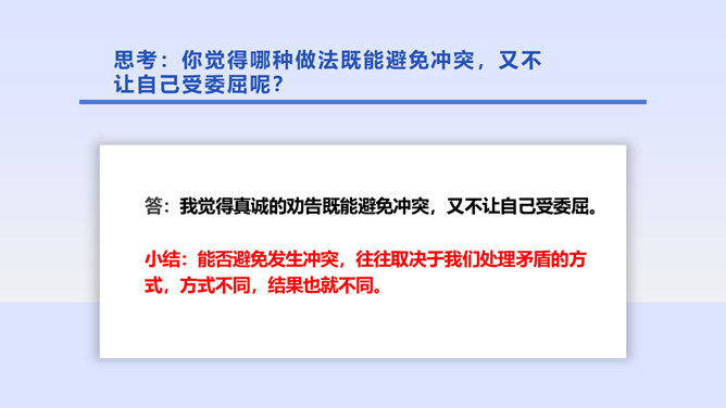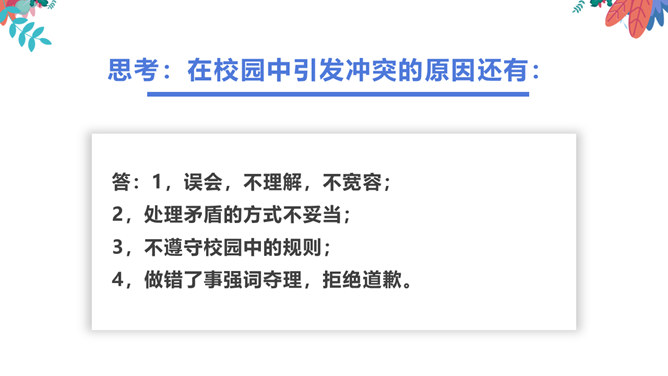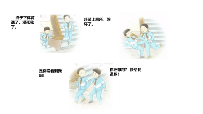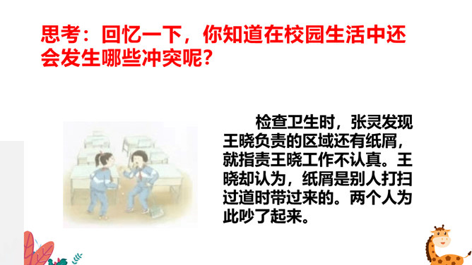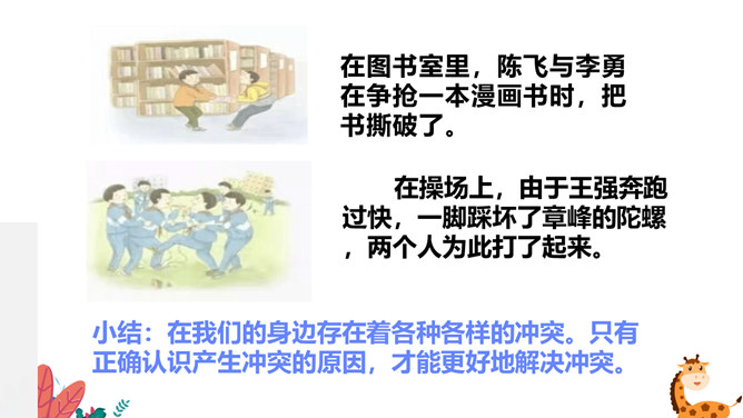 校园生活充满快乐,但也会出现一些冲突。思考:回忆一下,你知道在校园生活中还会发生哪些冲突呢?检查卫生时,张灵发现王晓负责的区域还有纸屑,就指责王晓工作不认真。王晓却认为,纸屑是别人打扫过道时带过来的。两个人为此吵了起来。在图书室里,陈飞与李勇在争抢一本漫画书时,把书撕破了。在操场上,由于王强奔跑过快,一脚踩坏了章峰的陀螺,两个人为此打了起来。小结:在我们的身边存在着各种各样的冲突。只有正确认识产生冲突的原因,才能更好地解决冲突。所属专题:当冲突发生ppt。