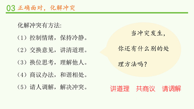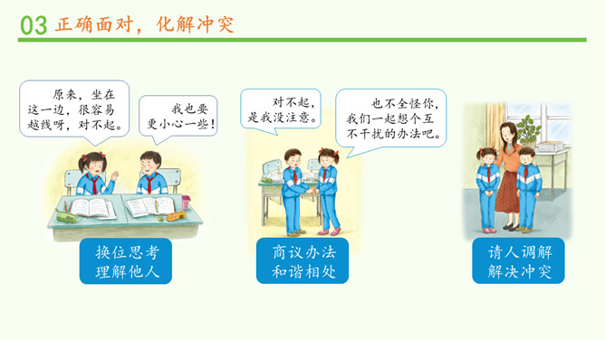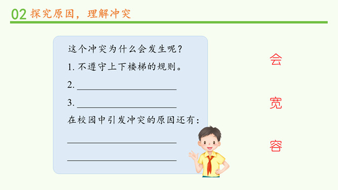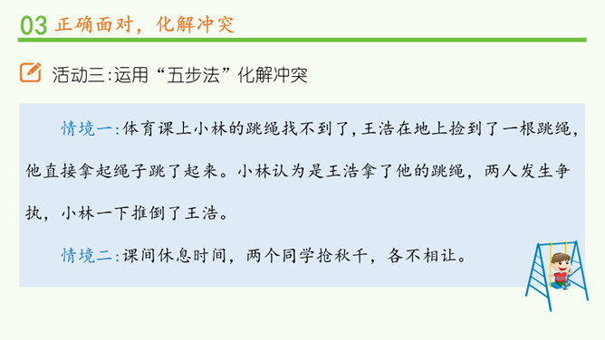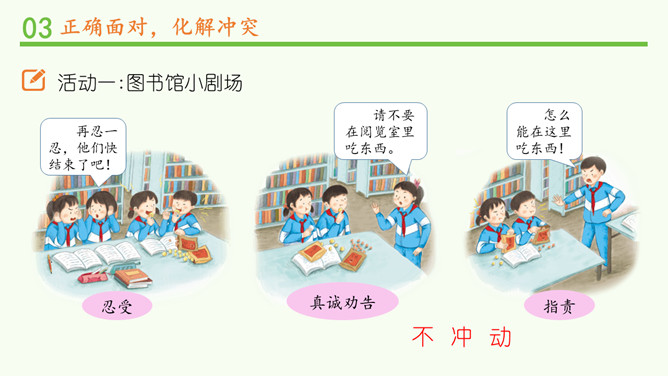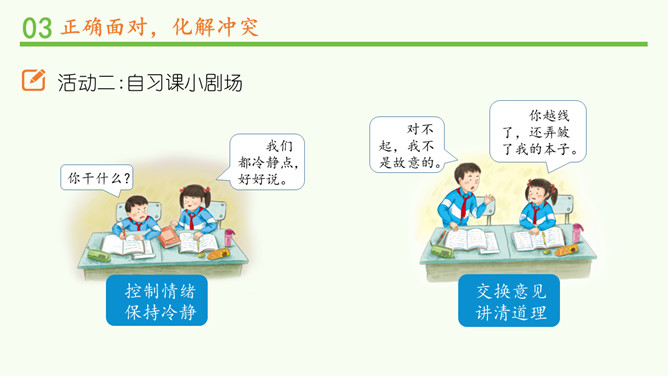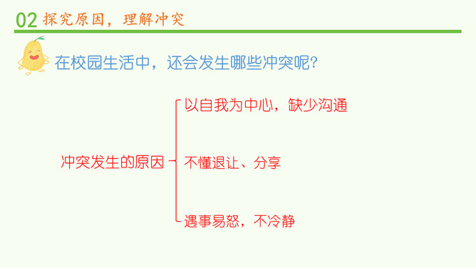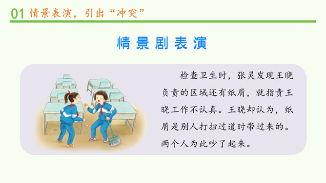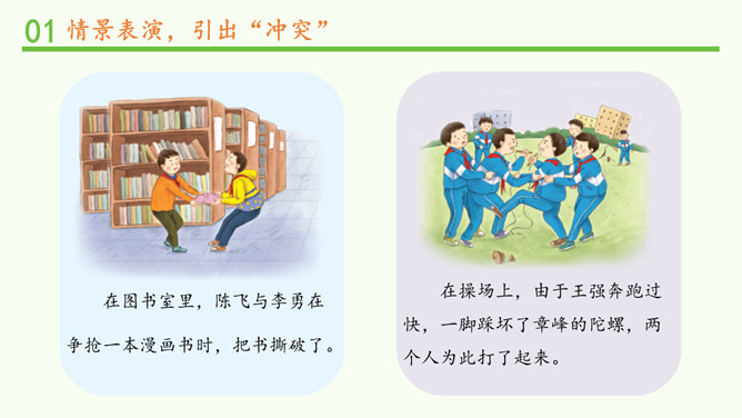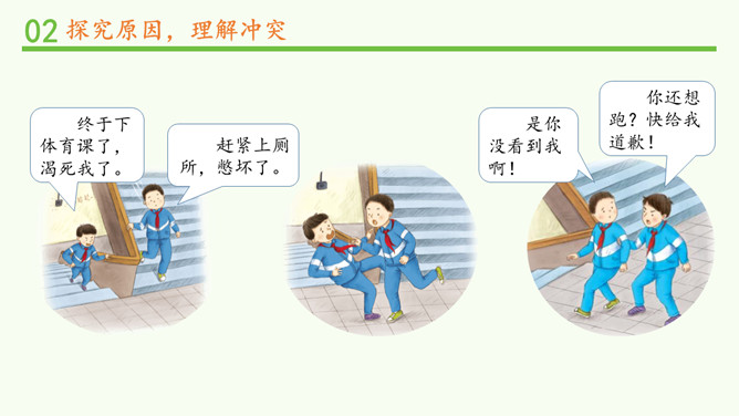 检查卫生时,张灵发现王晓负责的区域还有纸屑,就指责王晓工作不认真。王晓却认为,纸屑是别人打扫过道时带过来的。两个人为此吵了起来。在图书室里,陈飞与李勇在争抢一本漫画书时,把书撕破了。在操场上,由于王强奔跑过快,一脚踩坏了章峰的陀螺,两个人为此打了起来。在校园生活中,还会发生哪些冲突呢?冲突发生的原因:以自我为中心,缺少沟通;不懂退让、分享;遇事易怒,不冷静。 终于下体育课了,渴死我了。赶紧上厕所,憋坏了。是你没看到我啊!你还想跑?快给我道歉!所属专题:当冲突发生ppt。