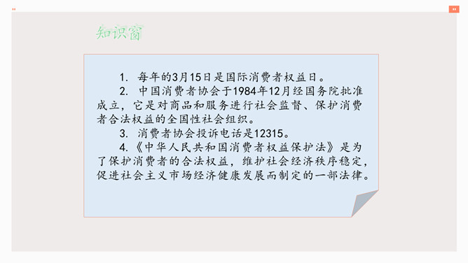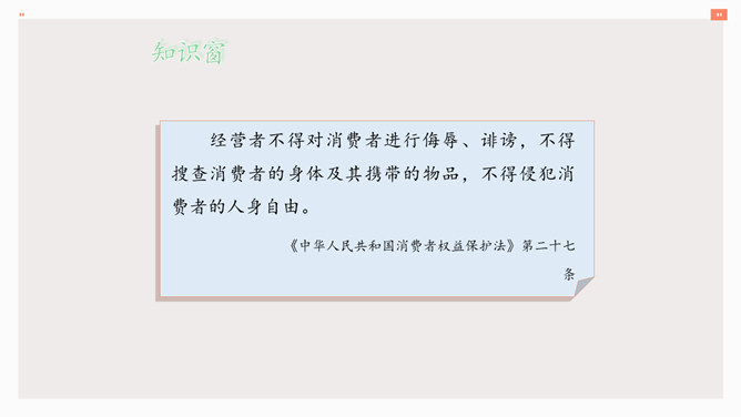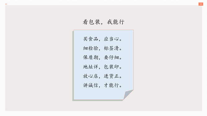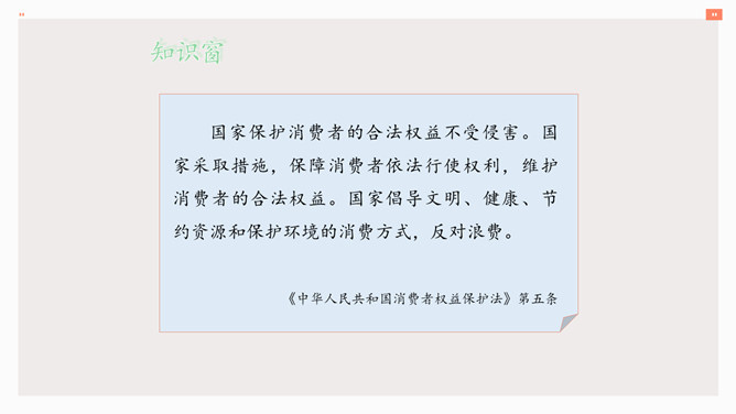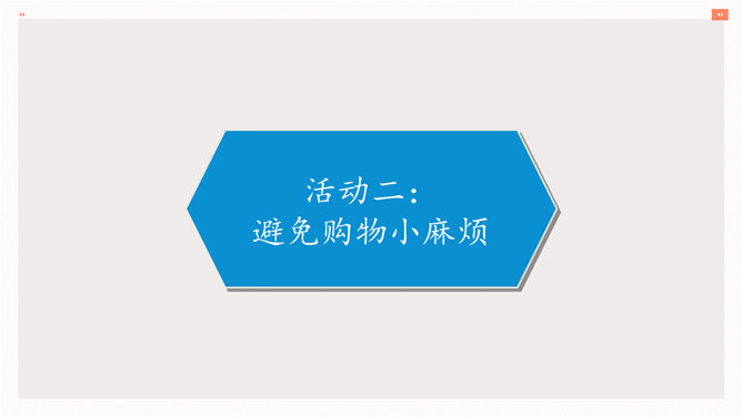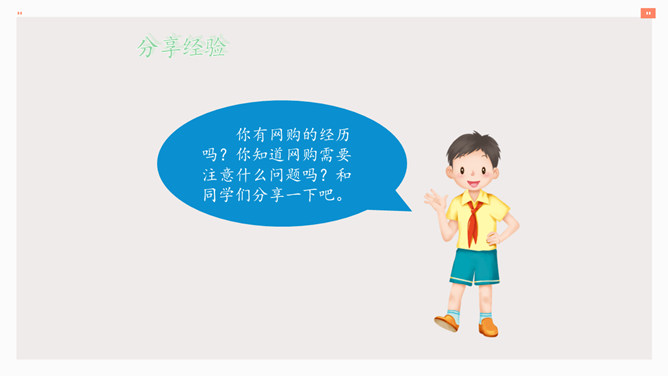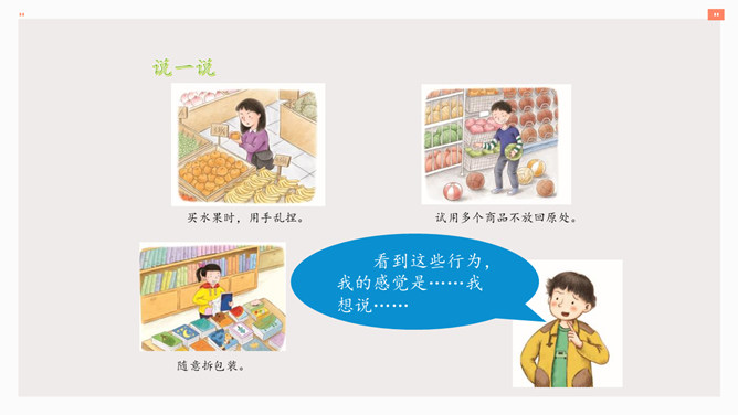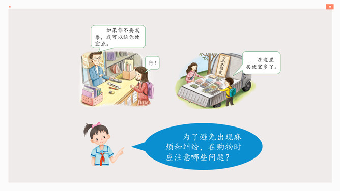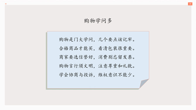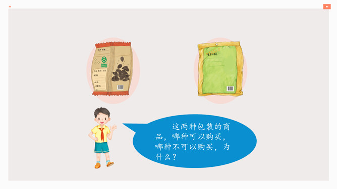 活动一:学会看包装。这两种包装的商品,哪种可以购买,哪种不可以购买,为什么?你都认识哪些商品标志呢?这些标志都代表着什么含义?活动二:避免购物小麻烦。为了避免出现麻烦和纠纷,在购物时应注意哪些问题?你有网购的经历吗?你知道网购需要注意什么问题吗?和同学们分享一下吧。活动三:购物讲文明。看到这些行为,我的感觉是……我想说……活动四:维权意识不能少。购物是门大学问,几个要点该记牢。合格商品才能买,看清包装很重要。商家要选信誉好,消费别忘留发票。购物言行须文明,注意尊重和礼貌。所属专题:买东西的学问ppt。