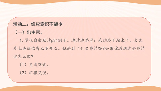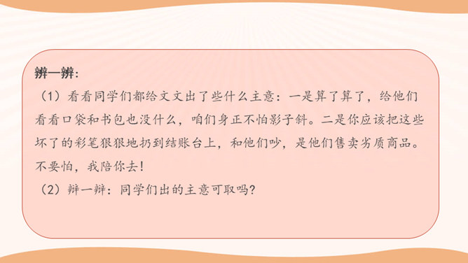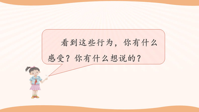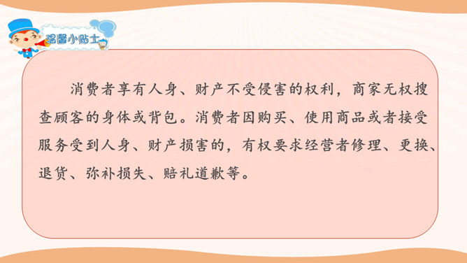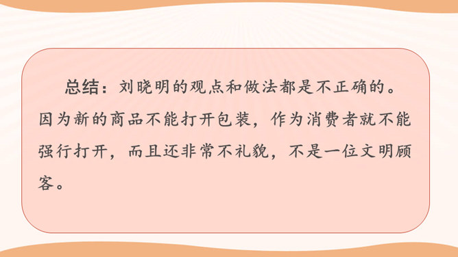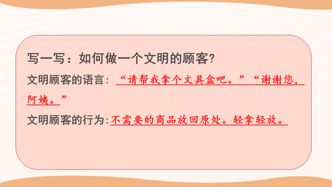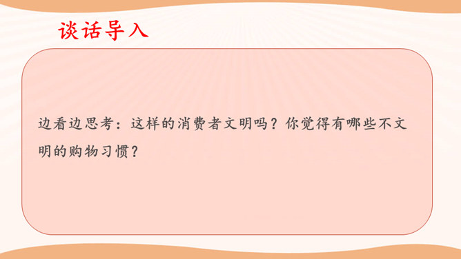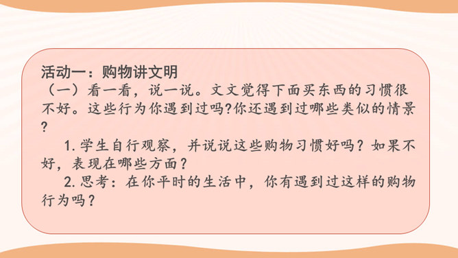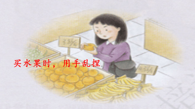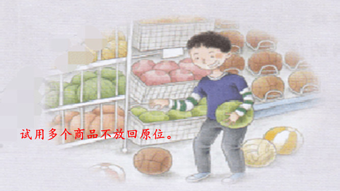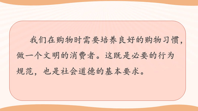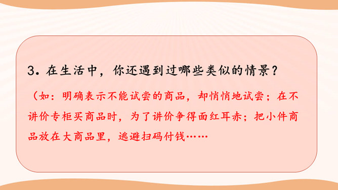 看一看,说一说。文文觉得下面买东西的习惯很不好。这些行为你遇到过吗?你还遇到过哪些类似的情景? 1.学生自行观察,并说说这些购物习惯好吗?如果不好,表现在哪些方面?2.思考:在你平时的生活中,你有遇到过这样的购物行为吗?3.在生活中,你还遇到过哪些类似的情景?明确表示不能试尝的商品,却悄悄地试尝;在不讲价专柜买商品时,为了讲价争得面红耳赤;把小件商品放在大商品里,逃避扫码付钱……我们在购物时需要培养良好的购物习惯,做一个文明的消费者。这既是必要的行为规范,也是社会道德的基本要求。所属专题:买东西的学问ppt。