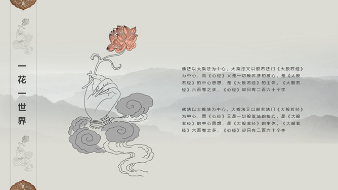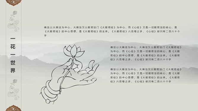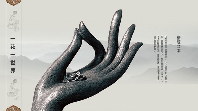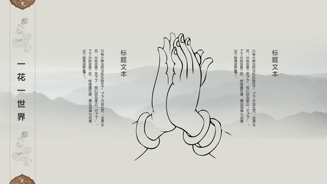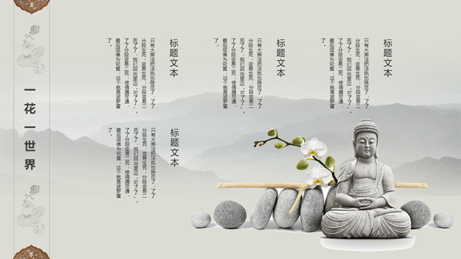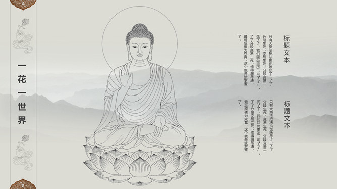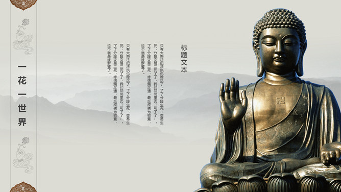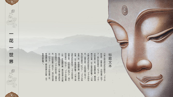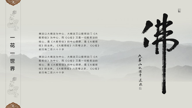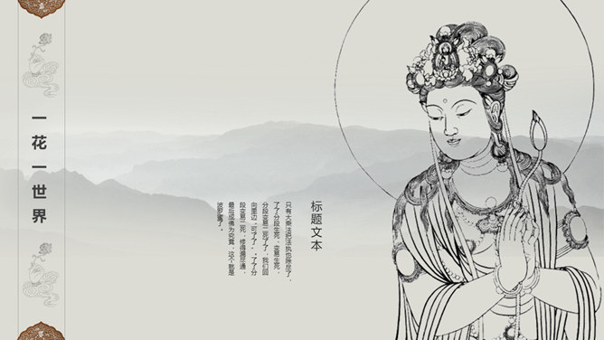 佛像禅意佛教文化PPT模板。一套佛教主题幻灯片模板,禅意水墨远山、佛像元素背景,适合佛教文化相关知识内容。