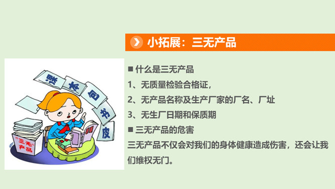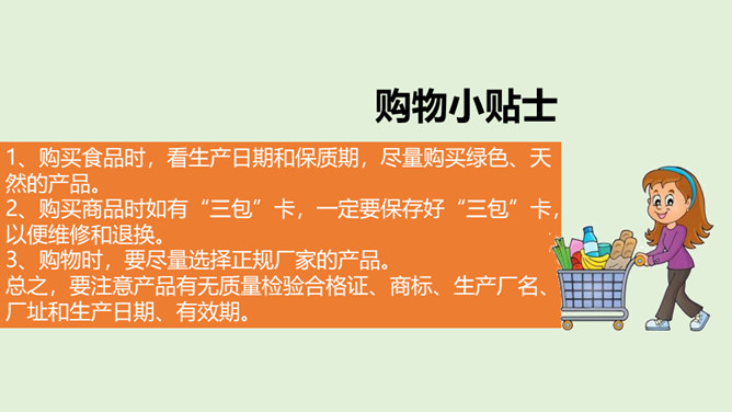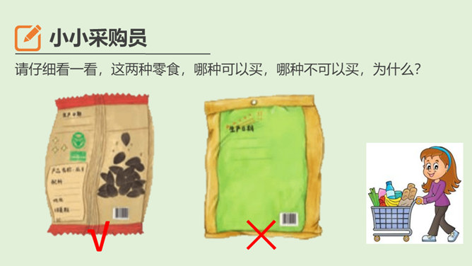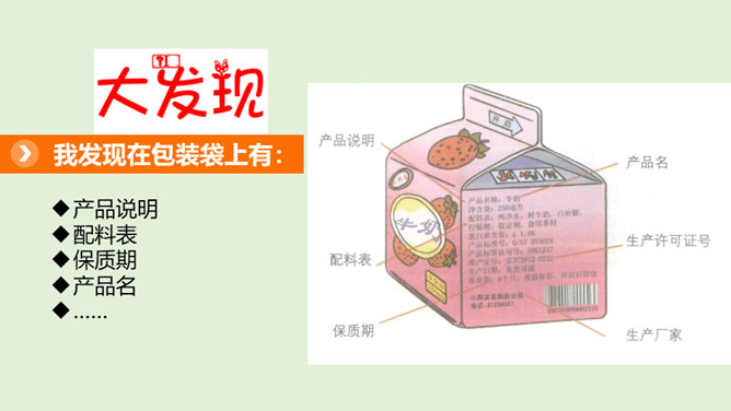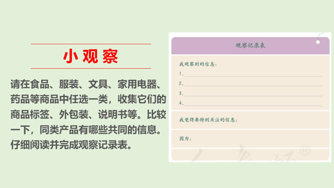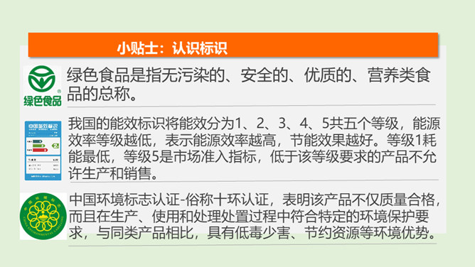 原来食用过期食品竟然会造成这么大的危害,那么,我们要怎样才能知道食品是否过期了呢?正规商品的外包装上一般都有厂名厂址、使用说明、生产日期等内容,这是我们了解商品信息的重要渠道。请在食品、服装、文具、家用电器、药品等商品中任选一类,收集它们的商品标签、外包装、说明书等。比较一下,同类产品有哪些共同的信息。仔细阅读并完成观察记录表。中国环境标志认证-俗称十环认证,表明该产品不仅质量合格,而且在生产、使用和处理处置过程中符合特定的环境保护要求,与同类产品相比,具有低毒少害、节约资源等环境优势。所属专题:买东西的学问ppt。