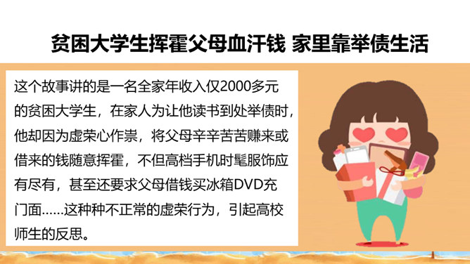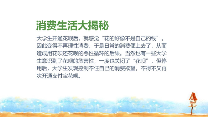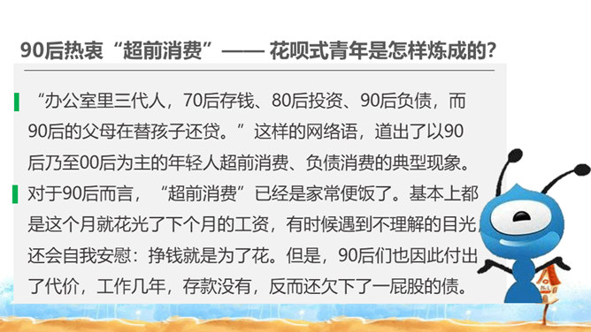 大学生开通花呗后,就感觉“花的好像不是自己的钱”。因此变得不再理性消费,于是日常的消费便上去了,从而造成用花呗还花呗的恶性循环的后果。当然也有一些大学生意识到了花呗的危害性,一度也关闭了“花呗”,但停用后,大学生发现控制不住自己的消费欲望,不得不又再次开通支付宝花呗。计划的过度消费会导致入不敷出、甚至负债累累,有计划的消费,是拥有健康生活的重要条件。请你想象一下,这两类不同的消费方式结果会有什么不同?你更支持哪种消费方式,为什么?所属专题:合理消费ppt。