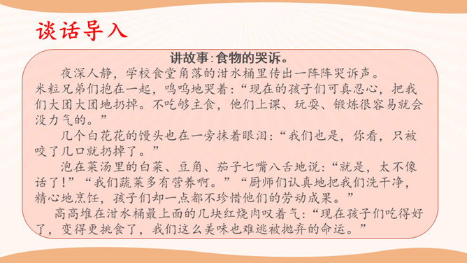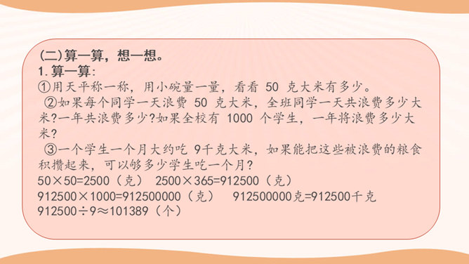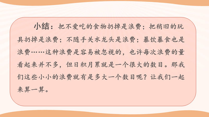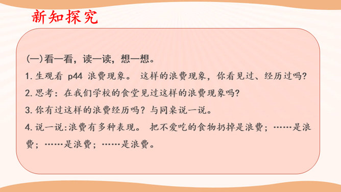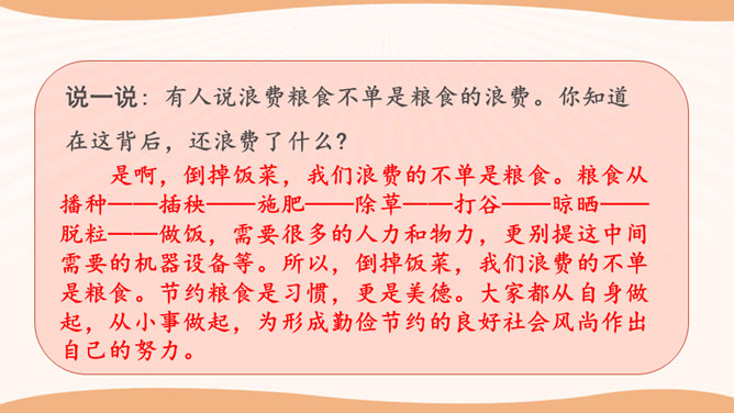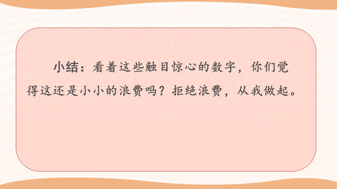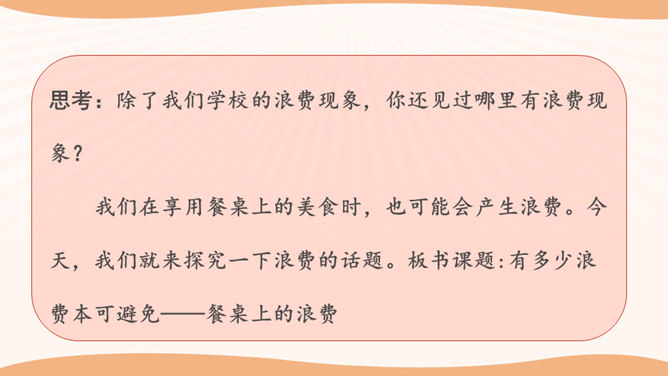 除了我们学校的浪费现象,你还见过哪里有浪费现象?我们在享用餐桌上的美食时,也可能会产生浪费。今天,我们就来探究一下浪费的话题。板书课题:有多少浪费本可避免——餐桌上的浪费。把不爱吃的食物扔掉是浪费;把稍旧的玩具扔掉是浪费;不随手关水龙头是浪费;暴饮暴食也是浪费……这种浪费是容易被忽视的,也许每次浪费的量看起来并不多,但日积月累就是一个很大的数目。那我们这些小小的浪费就有是多大一个数目呢?让我们一起来算一算。看着这些触目惊心的数字,你们觉得这还是小小的浪费吗?拒绝浪费,从我做起。所属专题:有多少浪费本可避免ppt。