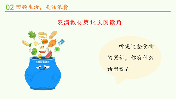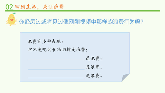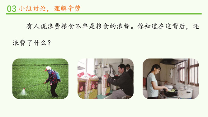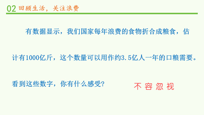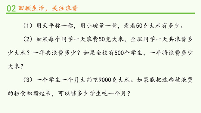 你经历过或者见过像刚刚视频中那样的浪费行为吗?听完这些食物的哭诉,你有什么话想说?(1)用天平称一称,用小碗量一量,看看50克大米有多少。(2)如果每个同学一天浪费50克大米,全班同学一天共浪费多少大米?一年共浪费多少?如果全校有500个学生,一年将浪费多少大米?(3)一个学生一个月大约吃9000克大米。如果能把这些被浪费的粮食积攒起来,可以够多少学生吃一个月?有数据显示,我们国家每年浪费的食物折合成粮食,估计有1000亿斤,这个数量可以用作约3.5亿人一年的口粮需要。看到这些数字,你有什么感受?所属专题:有多少浪费本可避免ppt。