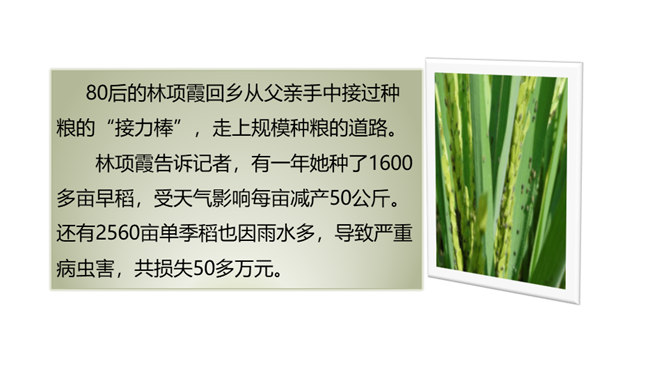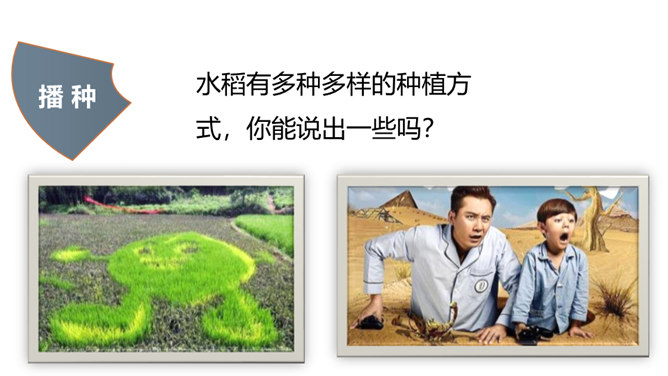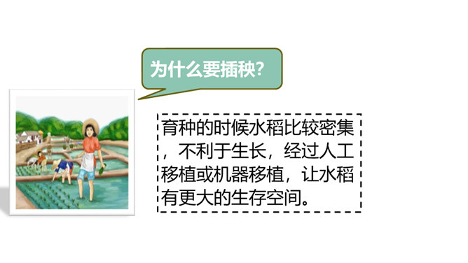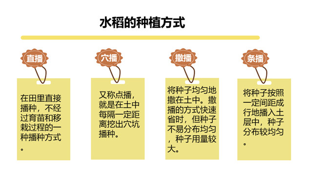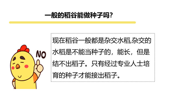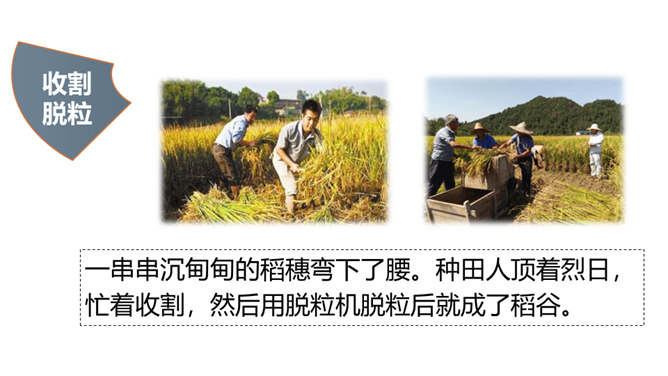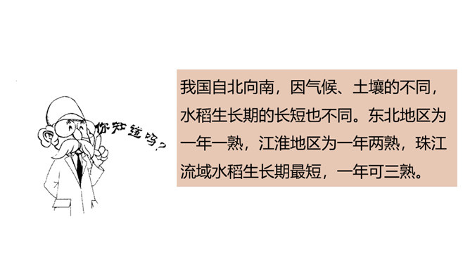 现在稻谷一般都是杂交水稻,杂交的水稻是不能当种子的,能长,但是结不出稻子。只有经过专业人士培育的种子才能接出稻子。我国自北向南,因气候、土壤的不同,水稻生长期的长短也不同。东北地区为一年一熟,江淮地区为一年两熟,珠江流域水稻生长期最短,一年可三熟。先辈们敬粮食若神明,不容丝毫亵渎。粮食有生命,也有灵性,吃饭不只是得口舌之快,还是生命与生命的相遇,人们咀嚼粮食也是咀嚼时光。人与粮食同行,有辛苦,有温暖,有感恩,有敬畏……所属专题:我们的衣食之源ppt。