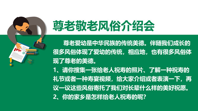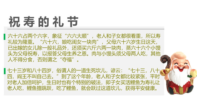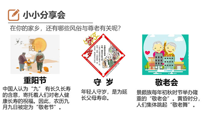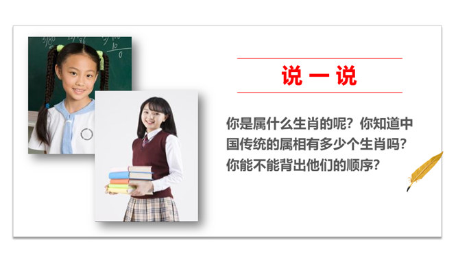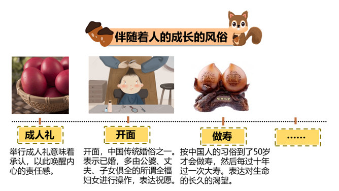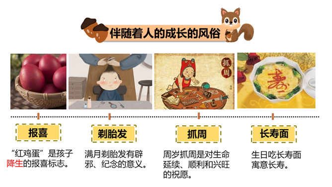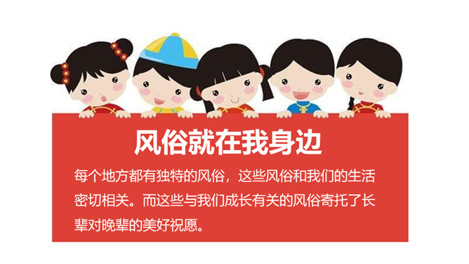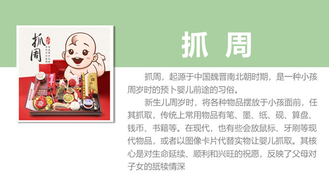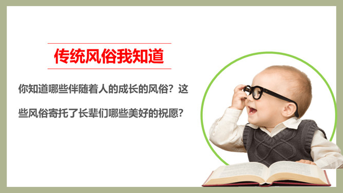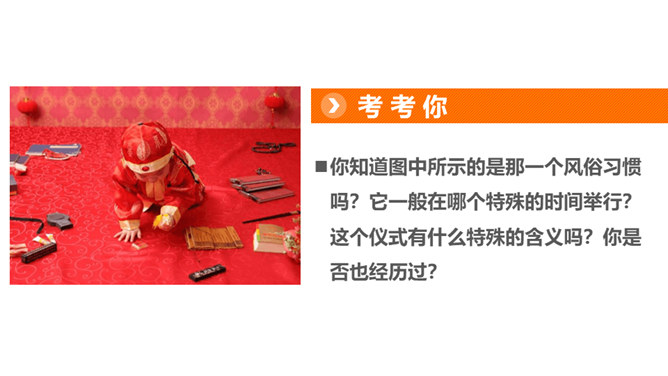 你知道图中所示的是那一个风俗习惯吗?它一般在哪个特殊的时间举行?这个仪式有什么特殊的含义吗?你是否也经历过?抓周,起源于中国魏晋南北朝时期,是一种小孩周岁时的预卜婴儿前途的习俗。你知道哪些伴随着人的成长的风俗?这些风俗寄托了长辈们哪些美好的祝愿?每个地方都有独特的风俗,这些风俗和我们的生活密切相关。而这些与我们成长有关的风俗寄托了长辈对晚辈的美好祝愿。你是属什么生肖的呢?你知道中国传统的属相有多少个生肖吗?你能不能背出他们的顺序?所属专题:我们当地的风俗ppt。