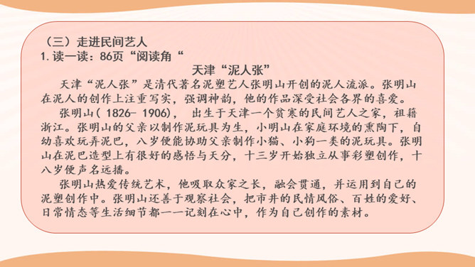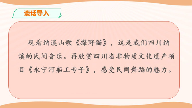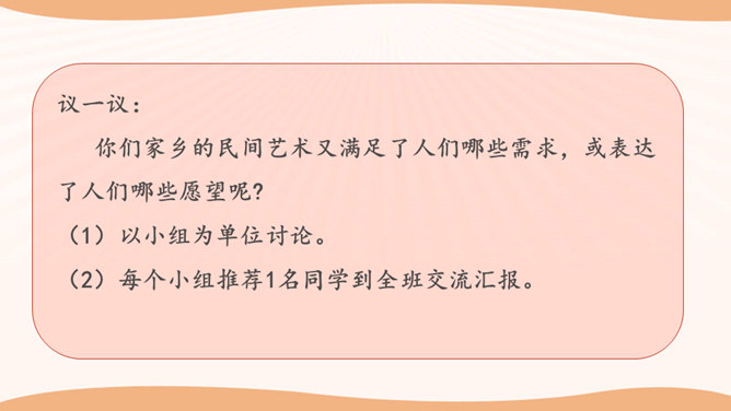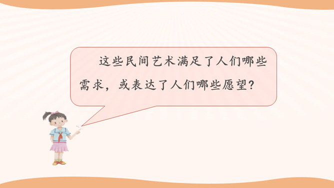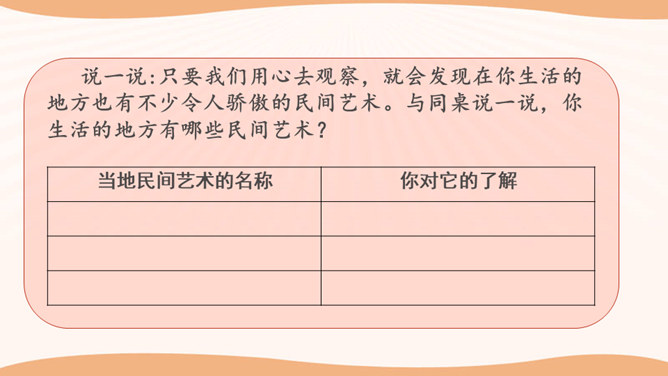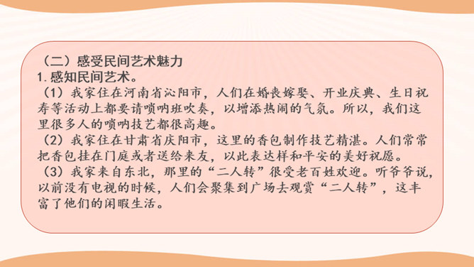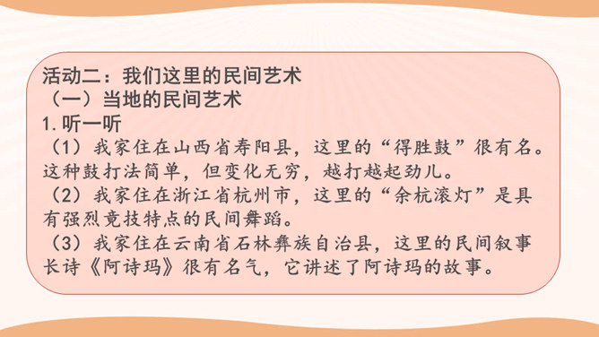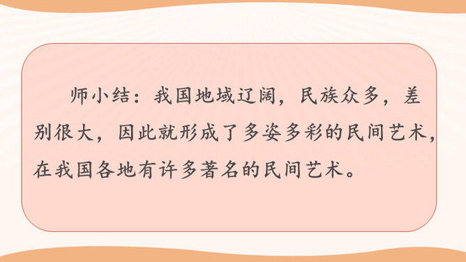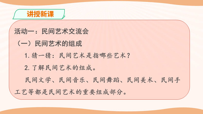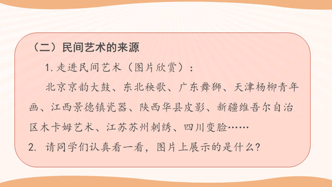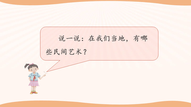 1.猜一猜:民间艺术是指哪些艺术?2.了解民间艺术的组成。民间文学、民间音乐、民间舞蹈、民间美术、民间手工艺等都是民间艺术的重要组成部分。我国地域辽阔,民族众多,差别很大,因此就形成了多姿多彩的民间艺术,在我国各地有许多著名的民间艺术。北京京韵大鼓、东北秧歌、广东舞狮、天津杨柳青年画、江西景德镇瓷器、陕西华县皮影、新疆维吾尔自治区木卡姆艺术、江苏苏州刺绣、四川变脸……说一说:只要我们用心去观察,就会发现在你生活的地方也有不少令人骄傲的民间艺术。与同桌说一说,你生活的地方有哪些民间艺术?所属专题:多姿多彩的民间艺术ppt。