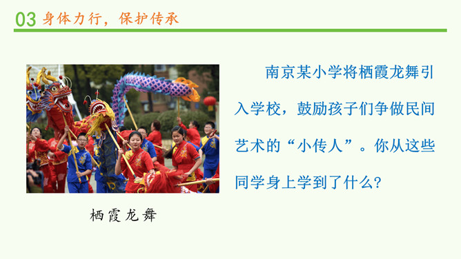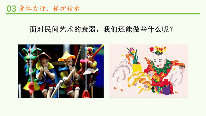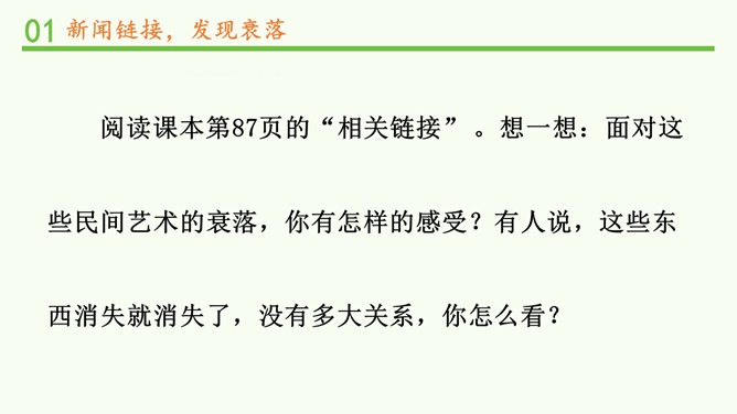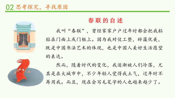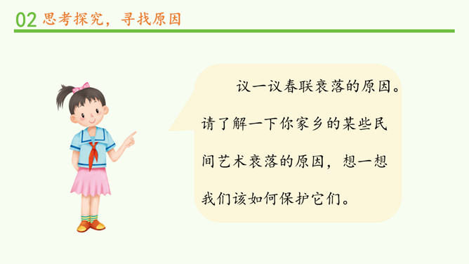想一想:面对这些民间艺术的衰落,你有怎样的感受?有人说,这些东西消失就消失了,没有多大关系,你怎么看?我叫“春联”,曾经家家户户过年时都会把我粘贴在门面上或门框上。因为我对仗工整,辞藻优美,既是中国书法艺术的体现,也是中国人美好生活愿望的表达。然而,随着时代的变化,我逐渐被人们冷落,尤其是在大城市中,不少年轻人觉得我土气,过年时不再用我。而且,现在会写毛笔字的人也越来越少了。议一议春联衰落的原因。请了解一下你家乡的某些民间艺术衰落的原因,想一想我们该如何保护它们。所属专题:多姿多彩的民间艺术ppt。