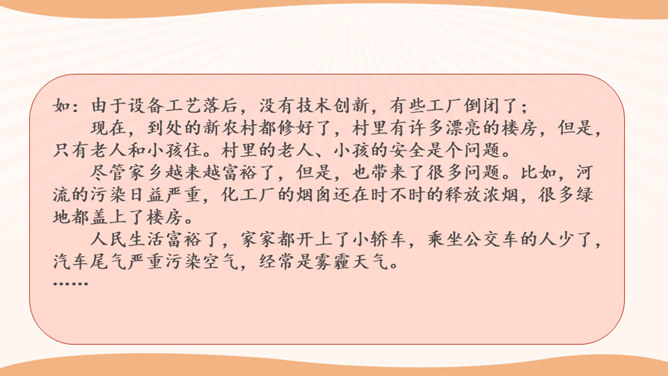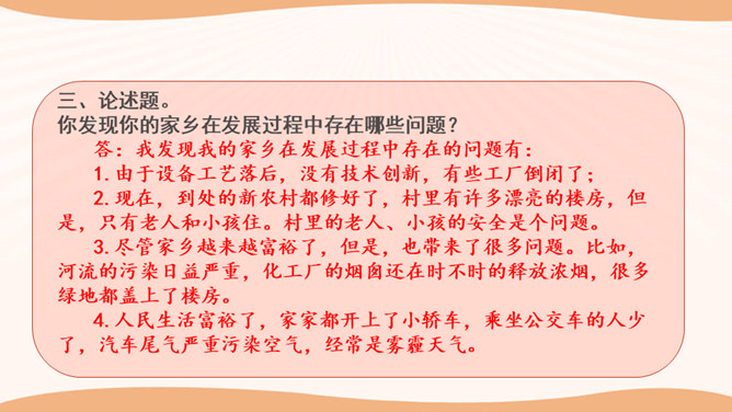 你发现你的家乡在发展过程中存在哪些问题?答:我发现我的家乡在发展过程中存在的问题有:1.由于设备工艺落后,没有技术创新,有些工厂倒闭了;2.现在,到处的新农村都修好了,村里有许多漂亮的楼房,但是,只有老人和小孩住。村里的老人、小孩的安全是个问题。3.尽管家乡越来越富裕了,但是,也带来了很多问题。比如,河流的污染日益严重,化工厂的烟囱还在时不时的释放浓烟,很多绿地都盖上了楼房。4.人民生活富裕了,家家都开上了小轿车,乘坐公交车的人少了,汽车尾气严重污染空气,经常是雾霾天气。所属专题:家乡的喜与忧ppt。