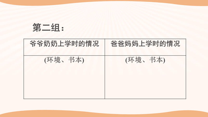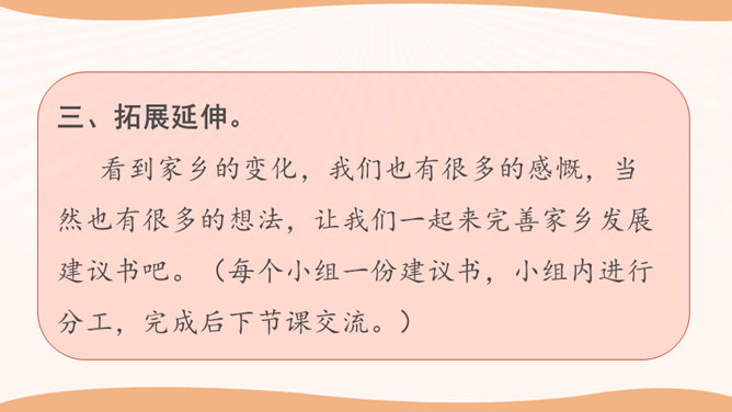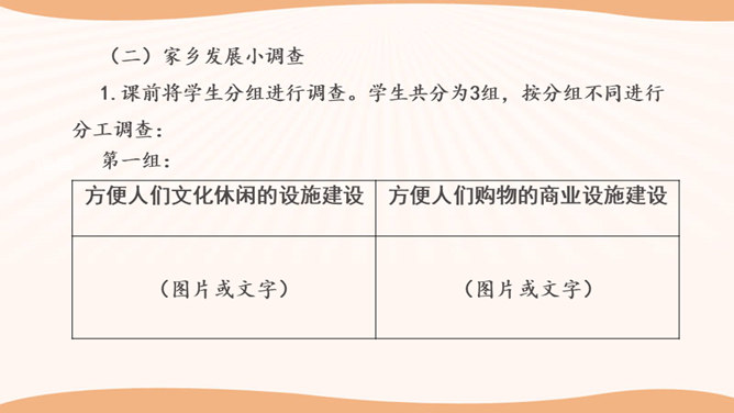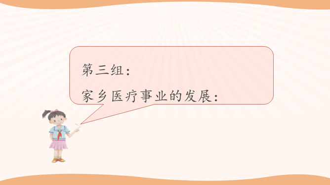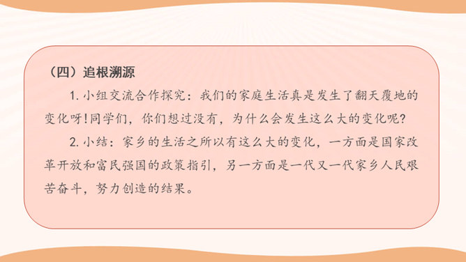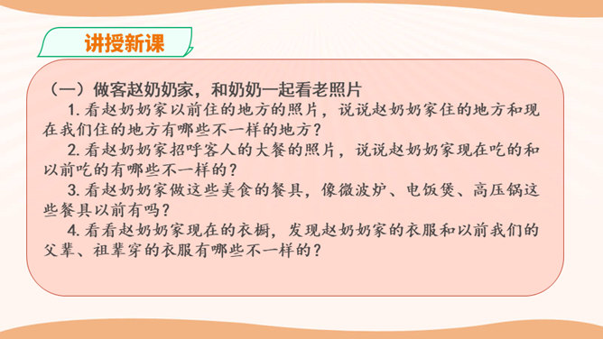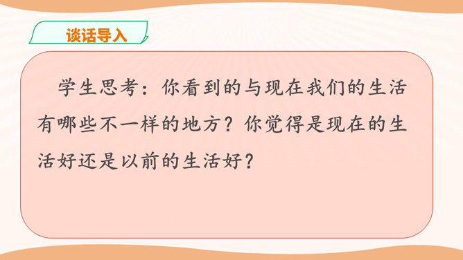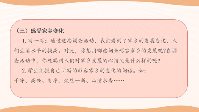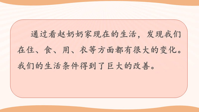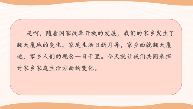 学生思考:你看到的与现在我们的生活有哪些不一样的地方?你觉得是现在的生活好还是以前的生活好?是啊,随着国家改革开放的发展,我们的家乡发生了翻天覆地的变化。家庭生活日新月异,家乡面貌翻天覆地,家乡人们的观念一日干里。今天就让我们共同来探讨家乡家庭生活方面的变化。通过看赵奶奶家现在的生活,发现我们在住、食、用、衣等方面都有很大的变化。我们的生活条件得到了巨大的改善。通过这些调查活动,我们看到了家乡的发展变化,人们生活水平的提高。对此,你想用哪些词来形容家乡的发展呢?所属专题:家乡的喜与忧ppt。