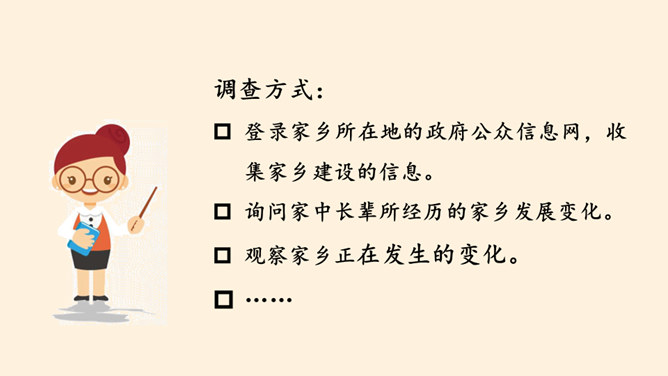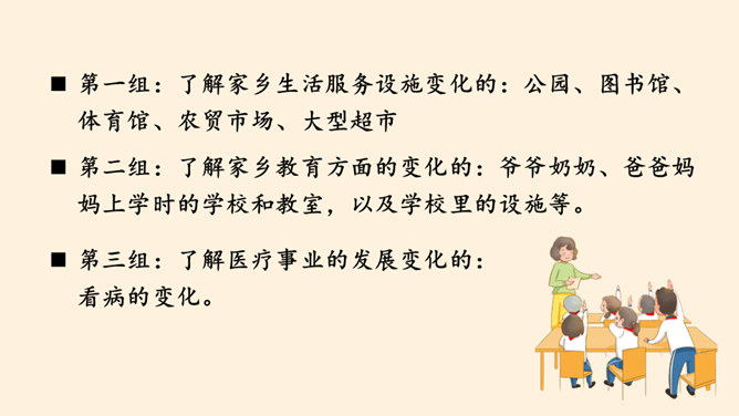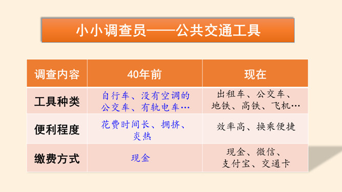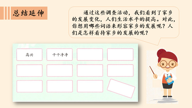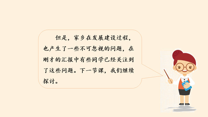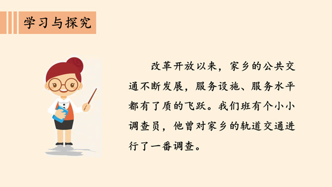 改革开放以来,家乡的公共交通不断发展,服务设施、服务水平都有了质的飞跃。我们班有个小小调查员,他曾对家乡的轨道交通进行了一番调查。请结合自己的生活经验,通过比较,谈感受。小结:轨道交通从无到有,为市民增添了新的出行方式和出行体验。请同学们按照课前分好的小队进行调查活动的汇报。主题为:家乡发展建设。通过这些调查活动,我们看到了家乡的发展变化,人们生活水平的提高。对此,你想用哪些词语来形容家乡的发展呢?人们是怎样看待家乡的发展的呢?所属专题:家乡的喜与忧ppt。