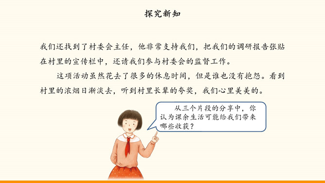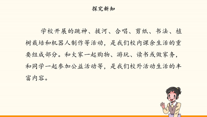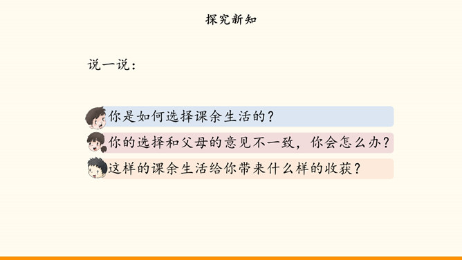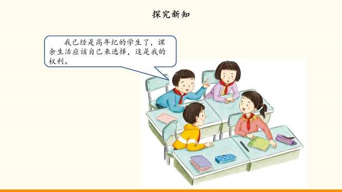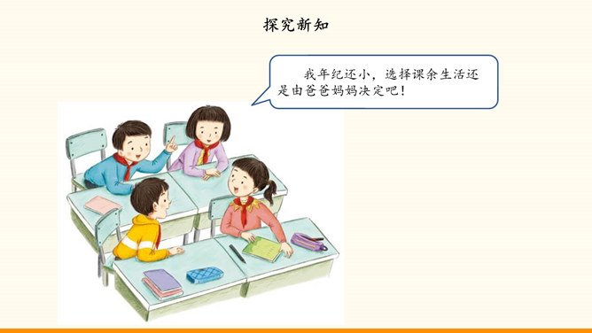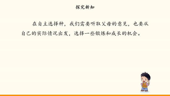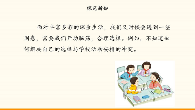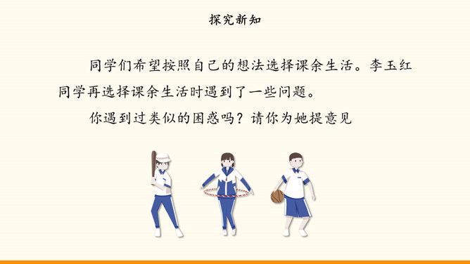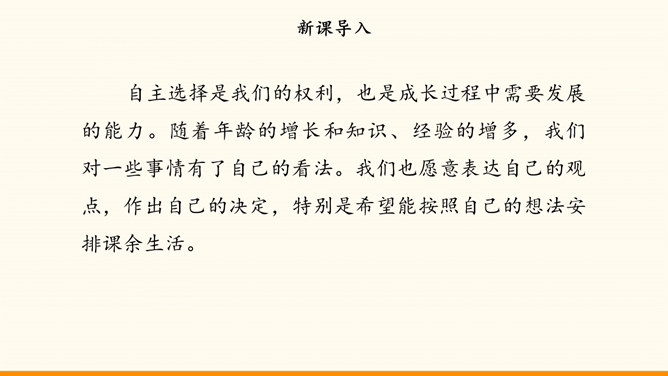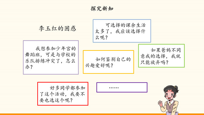 自主选择是我们的权利,也是成长过程中需要发展的能力。随着年龄的增长和知识、经验的增多,我们 对一些事情有了自己的看法。我们也愿意表达自己的观点,作出自己的决定,特别是希望能按照自己的想法安排课余生活。面对丰富多彩的课余生活,我们又时候会遇到一些困惑,需要我们开动脑筋,合理选择。例如,不知道如何解决自己的选择与学校活动安排的冲突。同学们希望按照自己的想法选择课余生活。李玉红同学再选择课余生活时遇到了一些问题。你遇到过类似的困惑吗?请你为她提意见。所属专题:自主选择课余生活ppt。