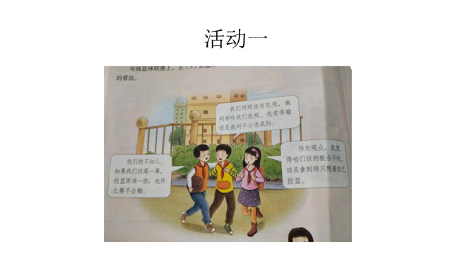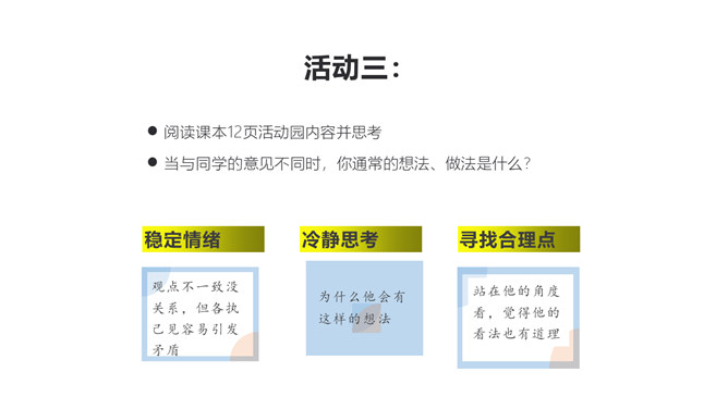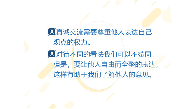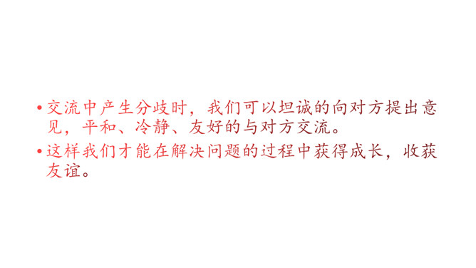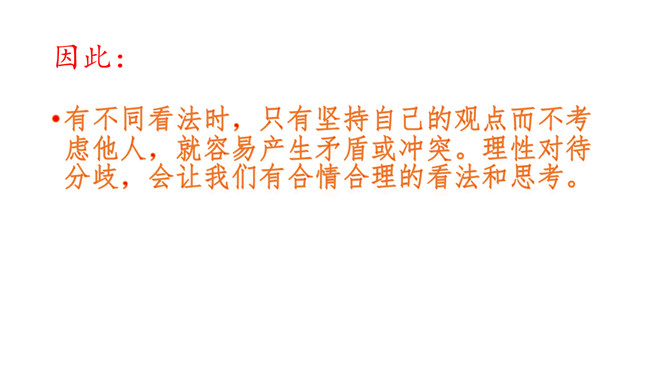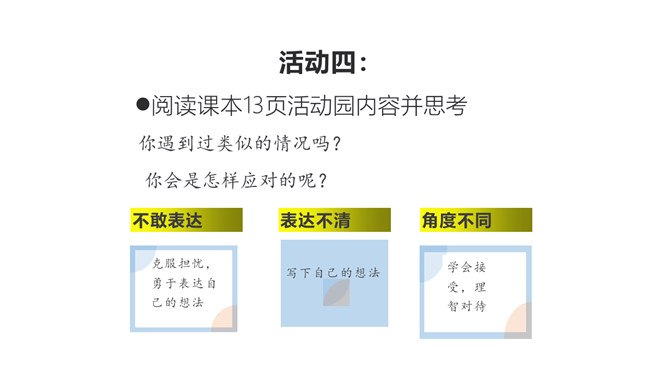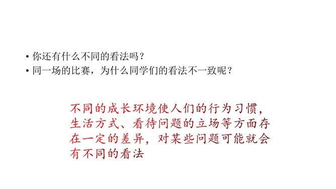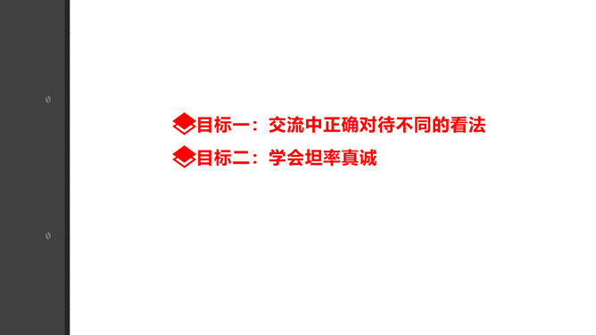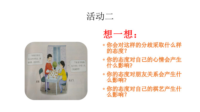 目标一:交流中正确对待不同的看法。目标二:学会坦率真诚。不同的成长环境使人们的行为习惯,生活方式、看待问题的立场等方面存在一定的差异,对某些问题可能就会有不同的看法。想一想:你会对这样的分歧采取什么样的态度?你的态度对自己的心情会产生什么影响?你的态度对朋友关系会产生什么影响?你的态度对自己的棋艺产生什么影响?有不同看法时,只有坚持自己的观点而不考虑他人,就容易产生矛盾或冲突。理性对待分歧,会让我们有合情合理的看法和思考。所属专题:学会沟通交流ppt。