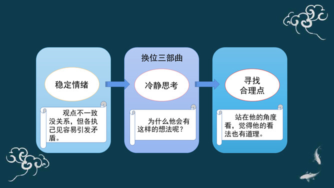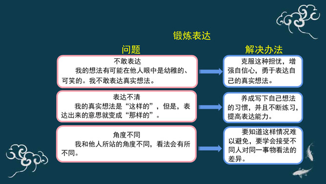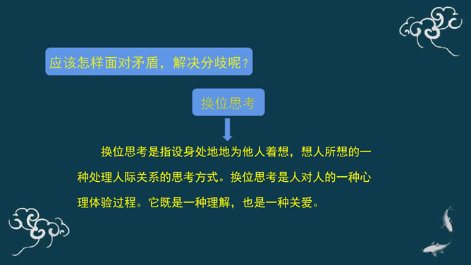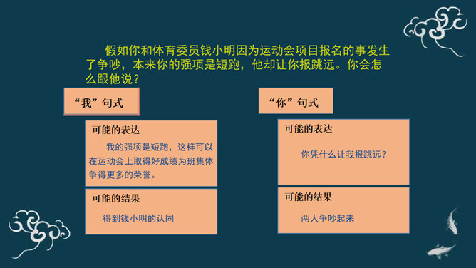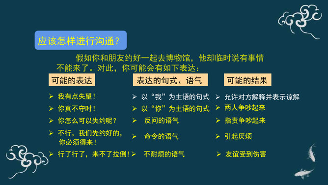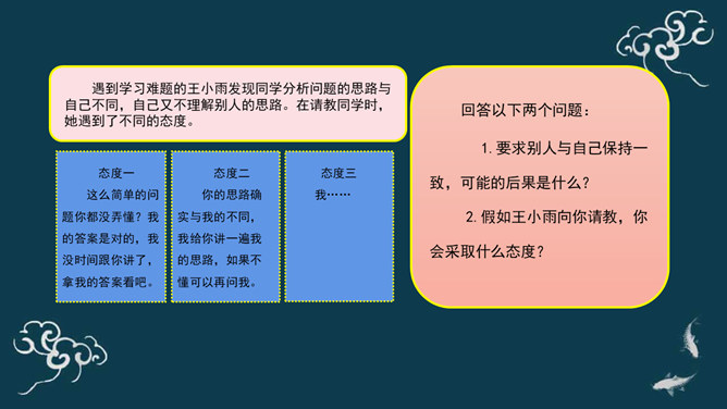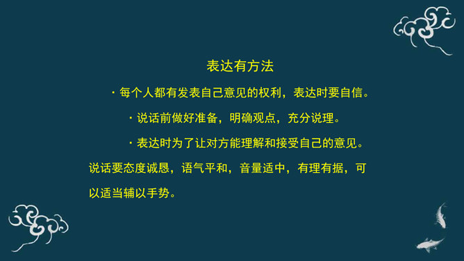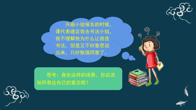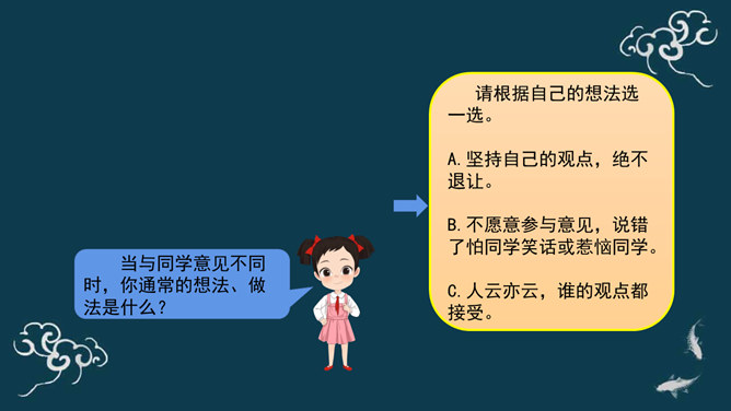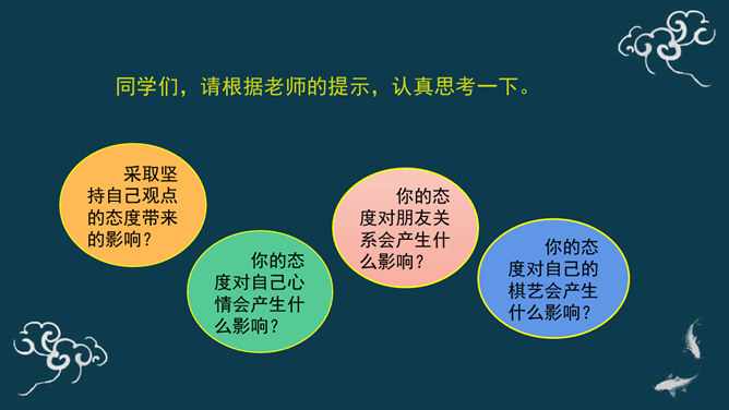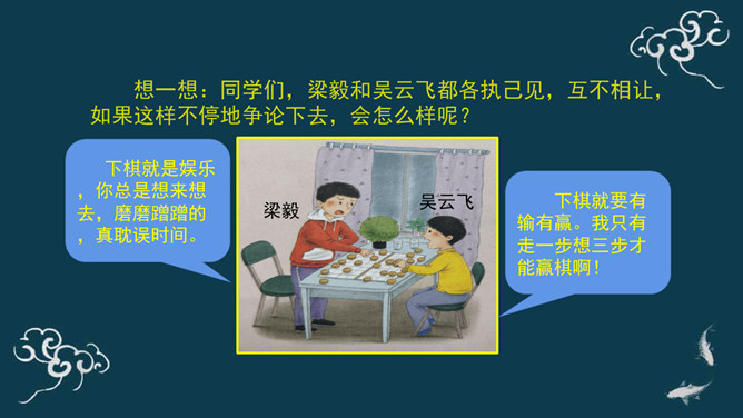 下棋就是娱乐,你总是想来想去,磨磨蹭蹭的,真耽误时间。下棋就要有输有赢。我只有走一步想三步才能赢棋啊!想一想:同学们,梁毅和吴云飞都各执己见,互不相让,如果这样不停地争论下去,会怎么样呢?同学们,请根据老师的提示,认真思考一下。采取坚持自己观点的态度带来的影响?你的态度对自己心情会产生什么影响?你的态度对朋友关系会产生什么影响?你的态度对自己的棋艺会产生什么影响?当与同学意见不同时,你通常的想法、做法是什么?A.坚持自己的观点,绝不退让。B.不愿意参与意见,说错了怕同学笑话或惹恼同学。所属专题:学会沟通交流ppt。